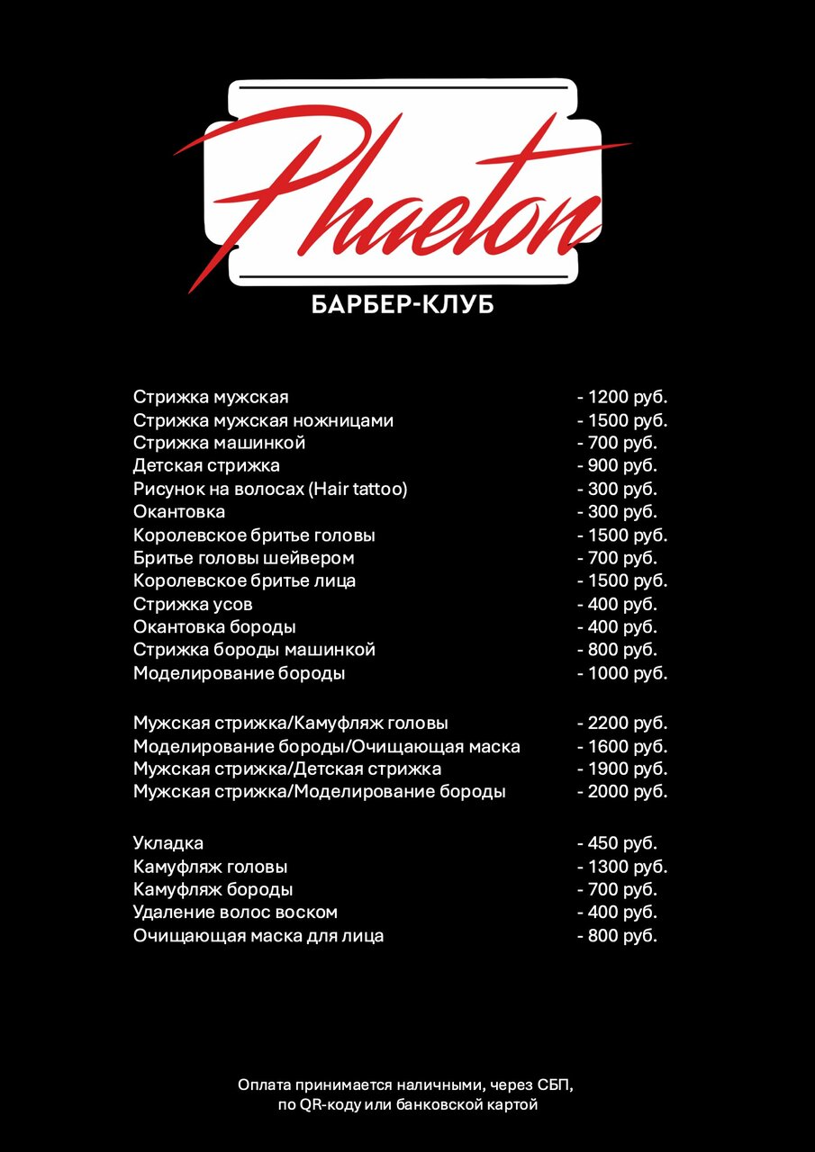 Скачать прайс-лист Phaeton Барбер-клуб на ноябрь 2025 года