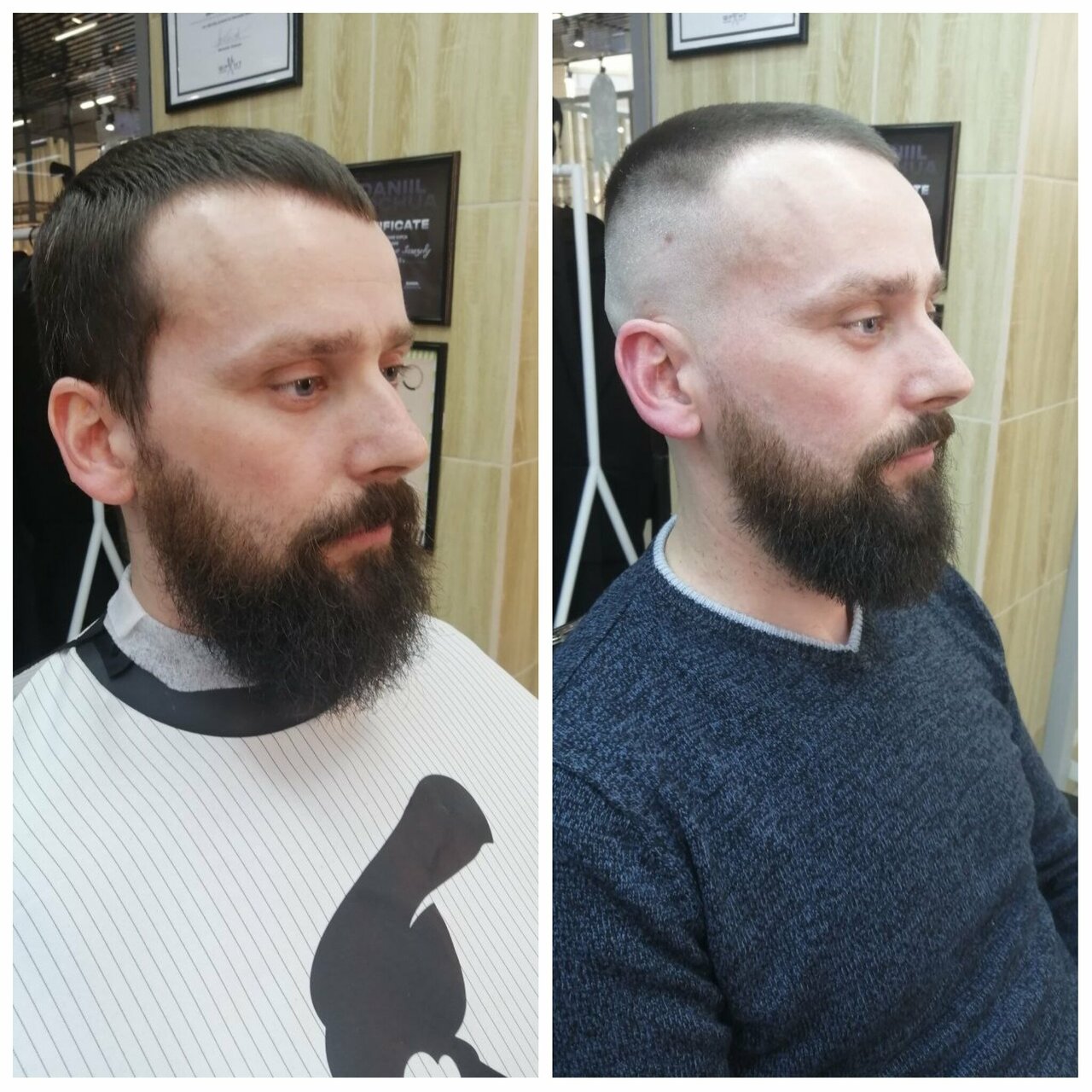 Стоимость услуги от 1500р до 1900р - зависит от стажа и опыта мастера. Стрижка машинкой головы с использованием до трёх насадок и оформление бороды без бритья