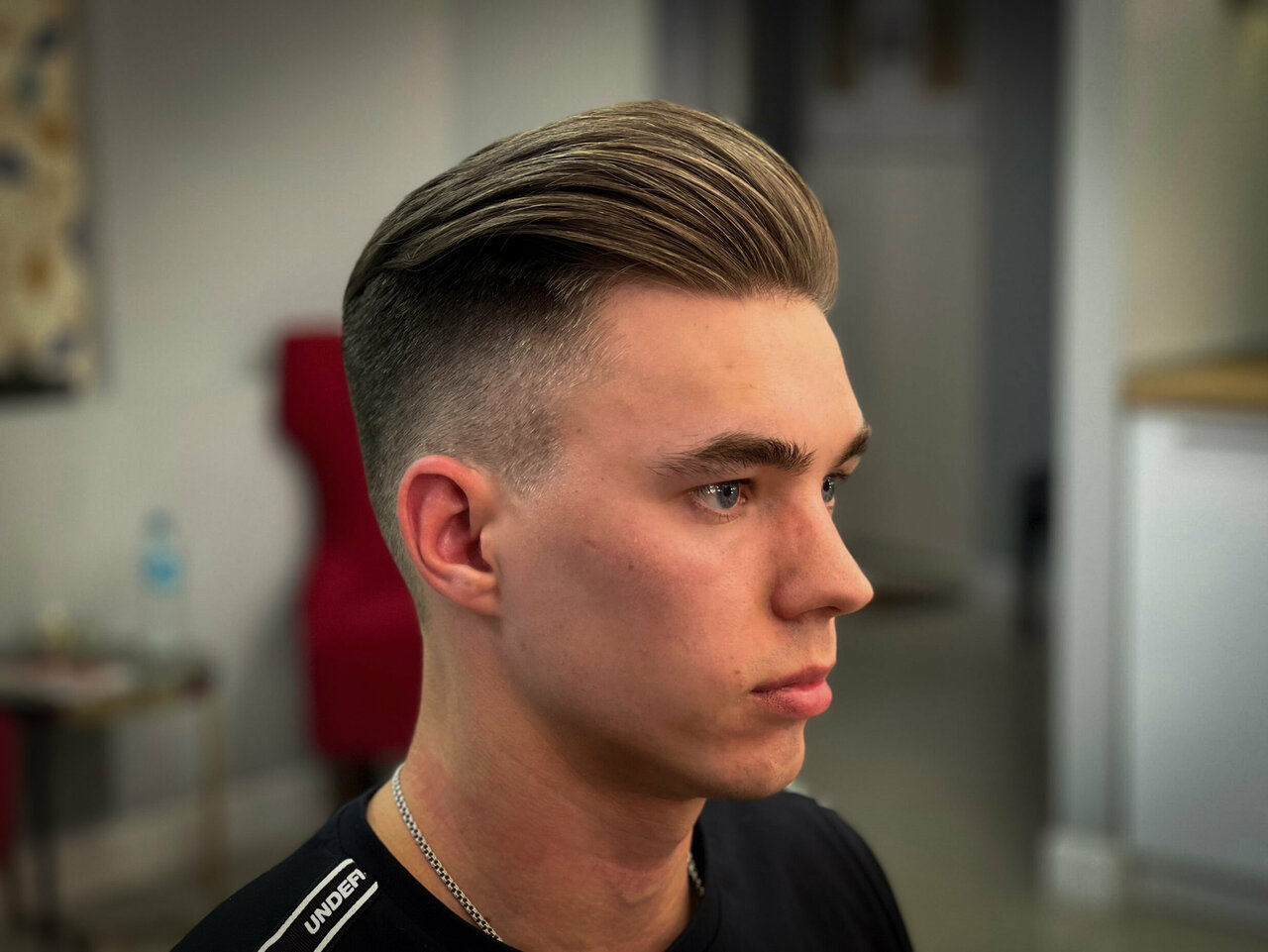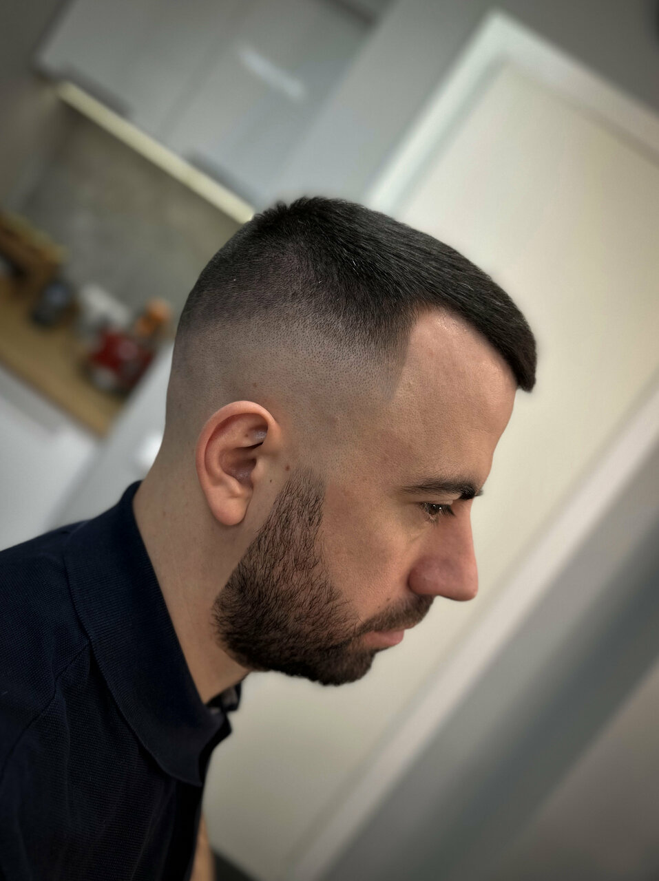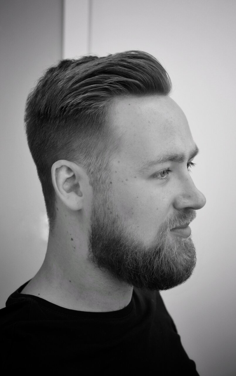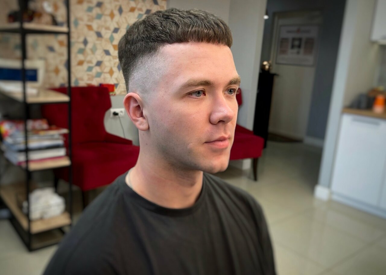 Fade-стрижка, при которой создается плавный переход от гладко выбритой кожи на шее и висках до желаемой длины на макушке (до 12мм). Услуга включает в себя мытье головы (по желанию)