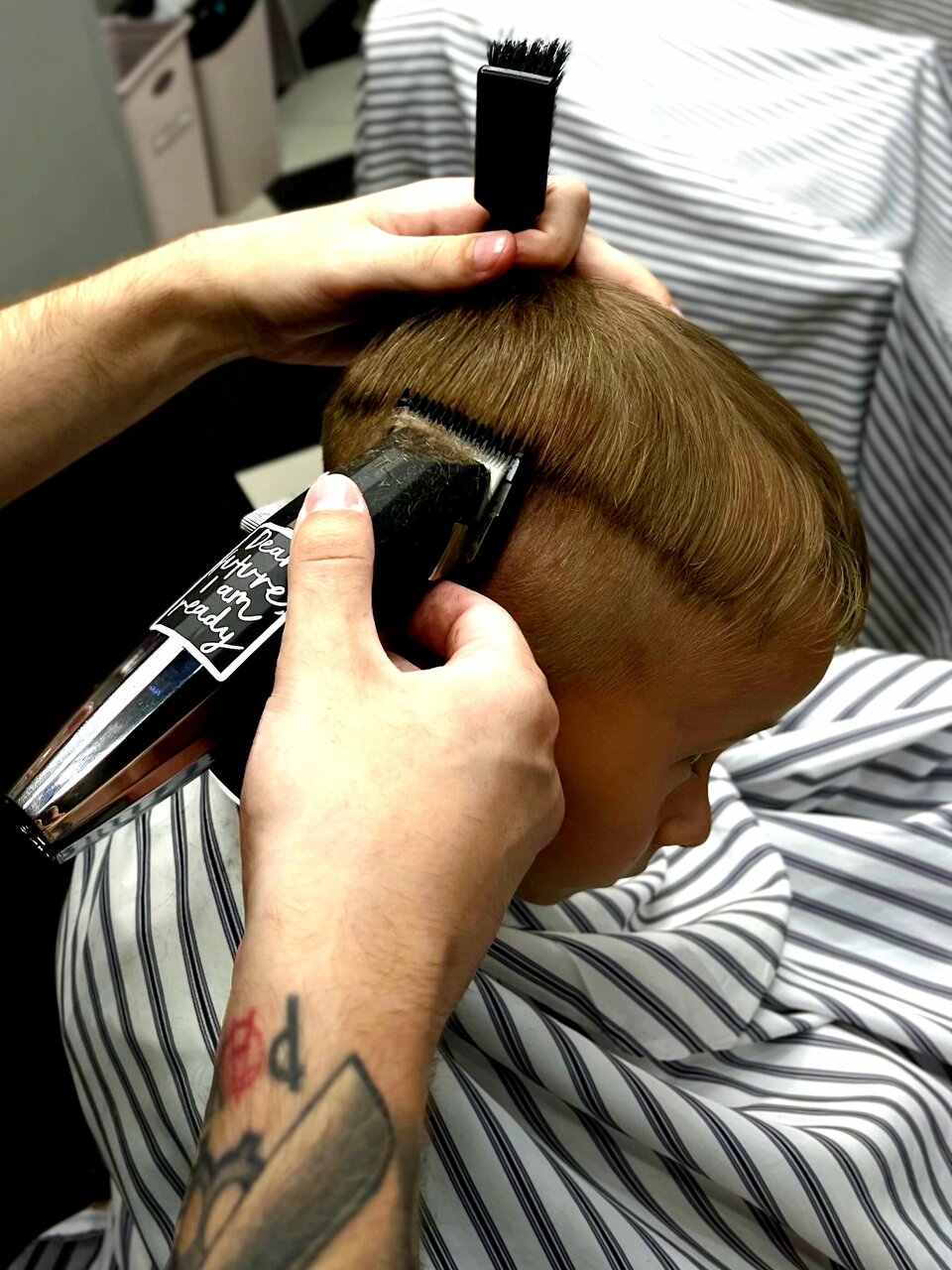 Услуга выполняется исключительно машинкой с применением не более двух насадок. Включает в себя мытьё головы до и после стрижки, а также укладку с применением профессиональных стайлинговых средств.