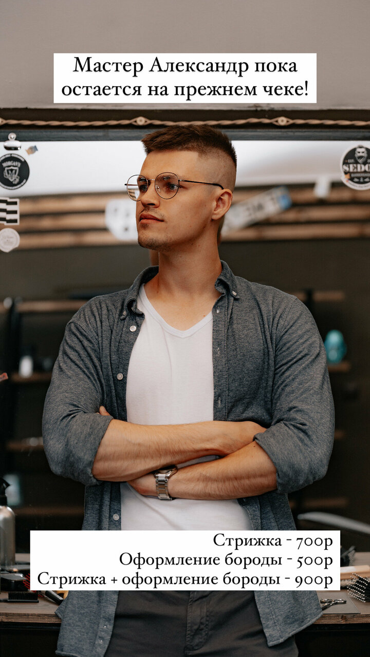 Комплекс Стрижка + борода:- Барбер - 1400р- Ведущий барбер - 1500р- Старший барбер - 1800р