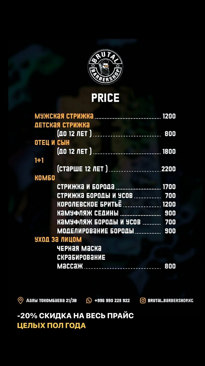Информация о барбершоп Brutal в Бишкеке актуализирована в ноябре 2025 года:
