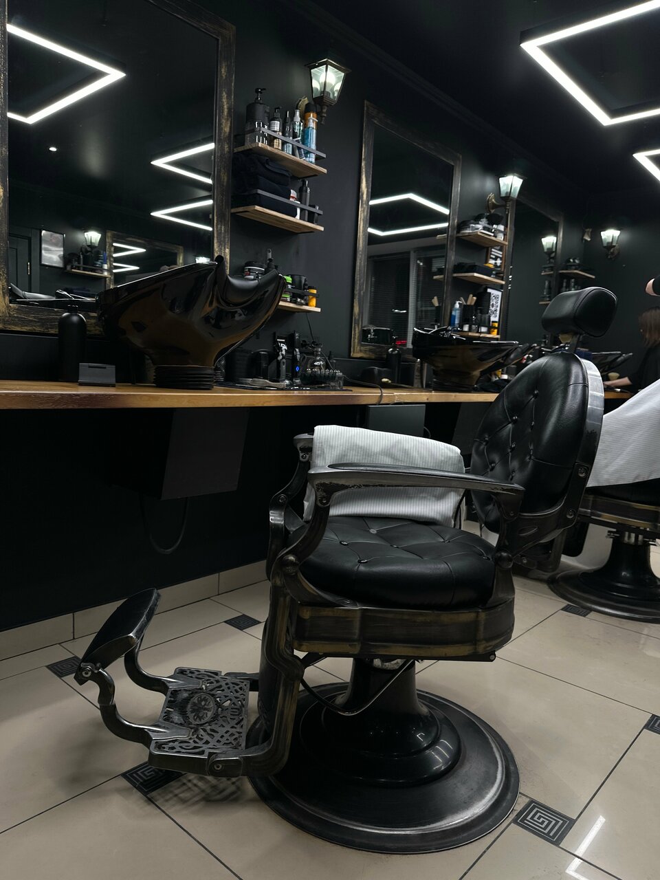 Очень интересный интерьер, мойки для головы персонально расположены перед зеркалом))) Не встречал, такого ни где))) все хорошие специалисты ! И ребёнку понравилось!!!