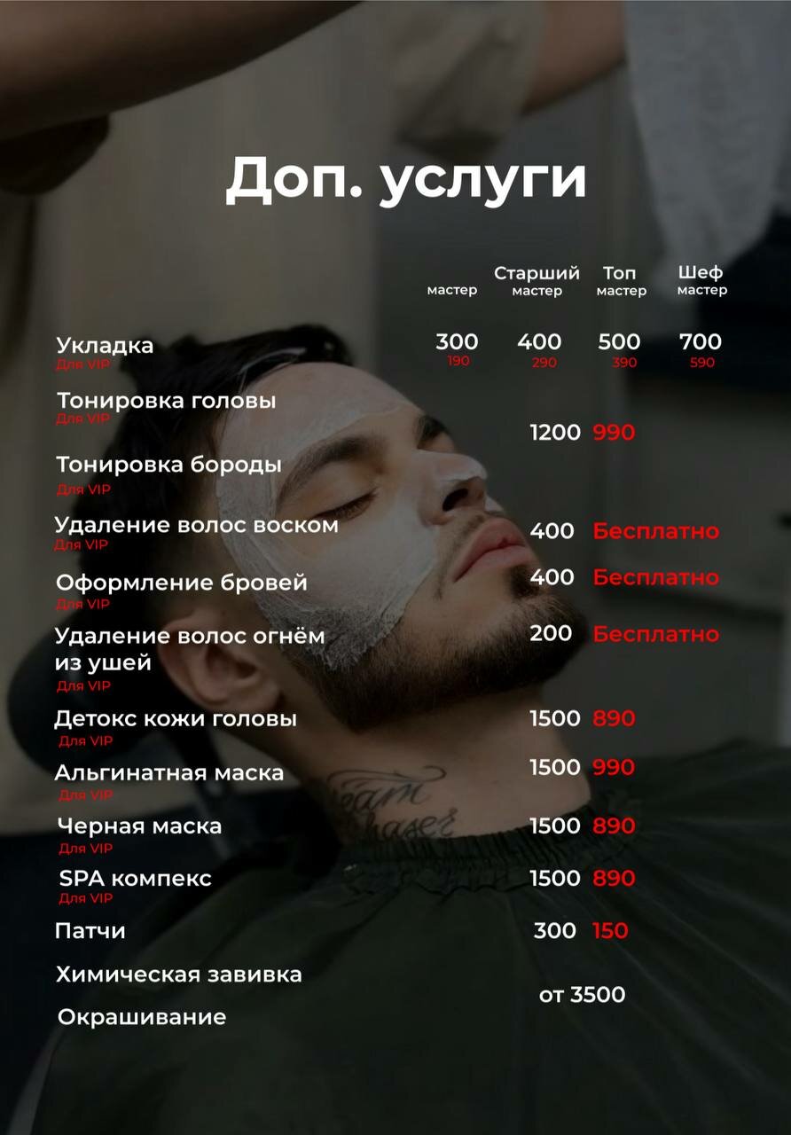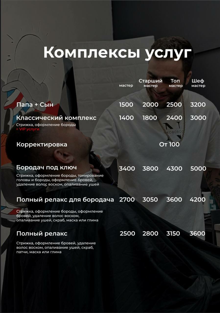 В комплекс входит: стрижка, оформление бороды, скраб, черная маска/глина и *VIP-услуги*при наличии VIP-картыМастер - 2700₽, старший мастер - 3050₽, топ-мастер-3600₽, шеф-мастер - 4200₽, арт-директор-4200