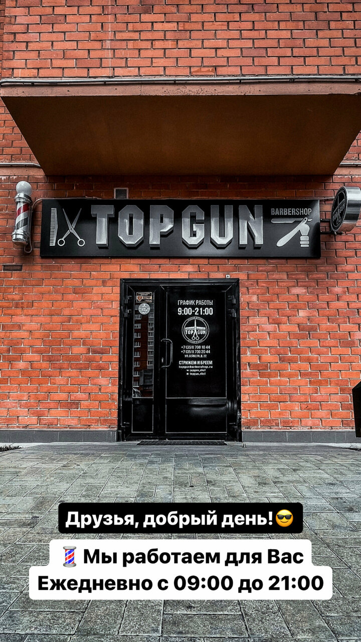 Режим работы барбершопа — ежедневно с 09:00 до 21:00. Для записи и консультаций можно обратиться к администратору по телефону +7 (351) 700-20-44. Подробная информация о услугах и мастерах доступна на сайте https://topgun.ru/.