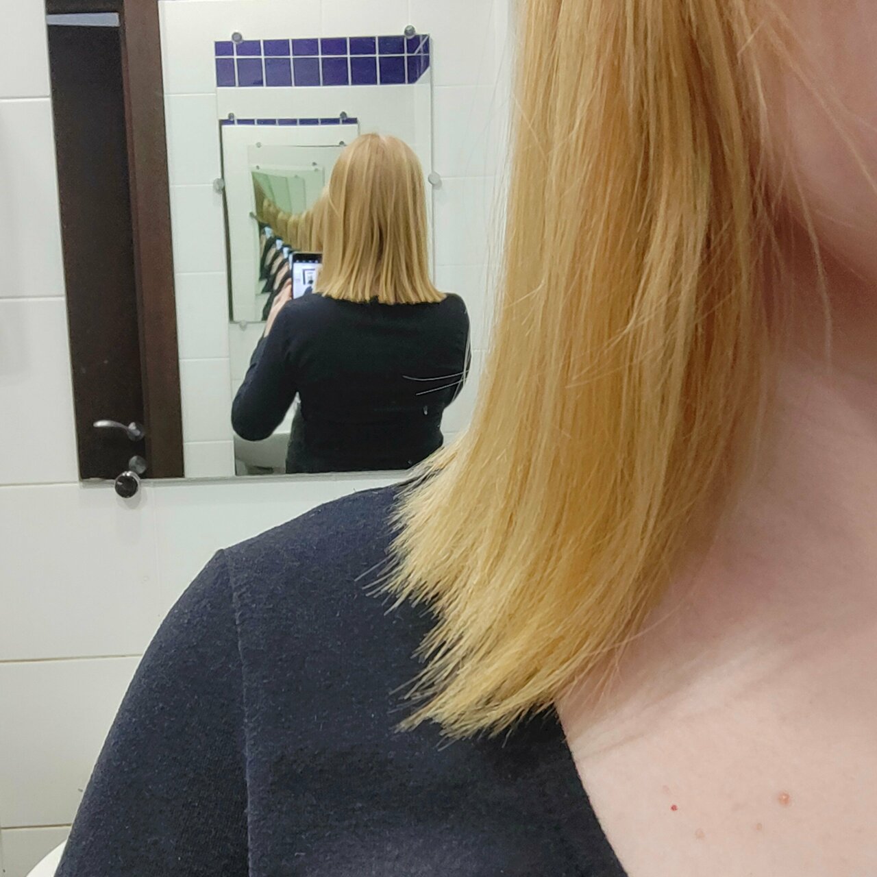 Пожелания по стрижке совсем не учли. Попросила подравнять кончики, сказала срезать как можно меньше, так как отращиваю длину и хотела лишь ровный срез. Как итог срезали сантиметров 5, так ещё и не ровно. Стригли меня стоя, так как мастер Александр владеет ‘профессиональной’ техникой и знает, как сделать ‘идеально ровный’ срез. В процессе стрижки жаловался на клиентов, что те не надевают бахилы, а персонал моет полы самостоятельно. Думаю, обсуждать это нужно не с клиентами, а с вышестоящим руководством. Прикладываю до и после.