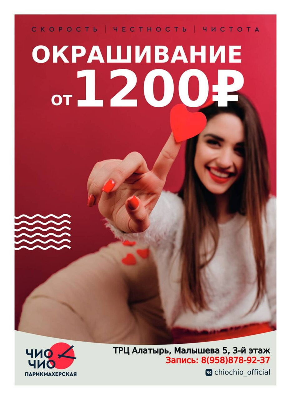 Сегодня, 22.07.2024 прогуливаясь по ТЦ Алатырь, случайно набрели на парикмахерскую Чио Чио. И не пожалела, мастер, к сожалению не познакомилась, исполнила мои пожелания и сотворила то,чего не многие могут сделать с моими кудрявыми волосами. Я в восторге, мои родные оценили по достинству работу специалиста. Зайду ещё.