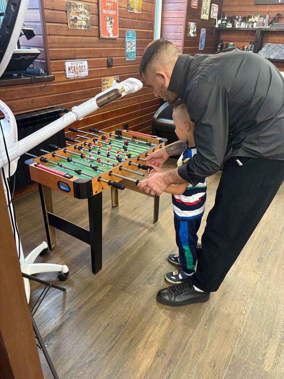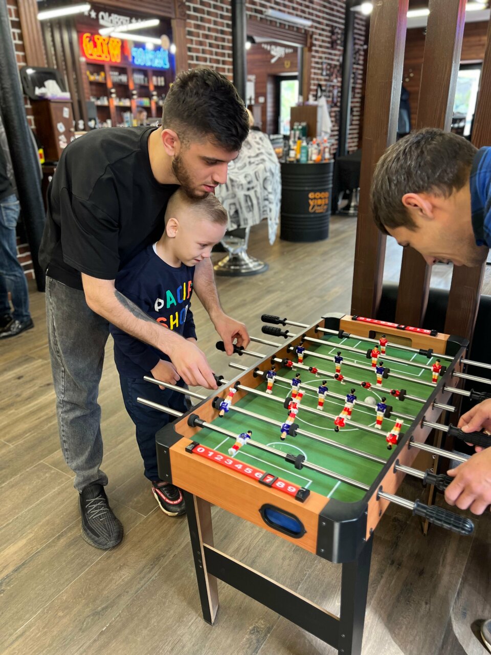 Прекрасный Барбер шоп, высокий профессионализм работников, а также низкие цены. Классный интерьер, а пока ждешь можно сыграть в плойку или настольный футбол, выпивая бесплатный напиток.