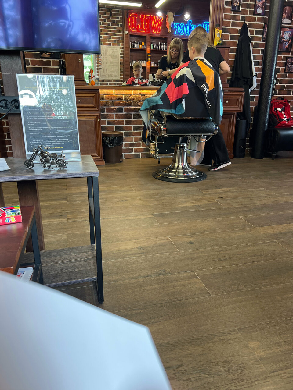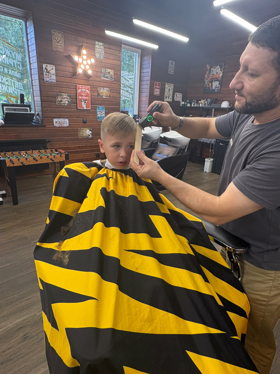 Супер обслуживание,ходили к барберу Захару результат супер,администраторы очень вежливые,пока ждешь ребенка можно и кофейку попить)очень приятная атмосфера