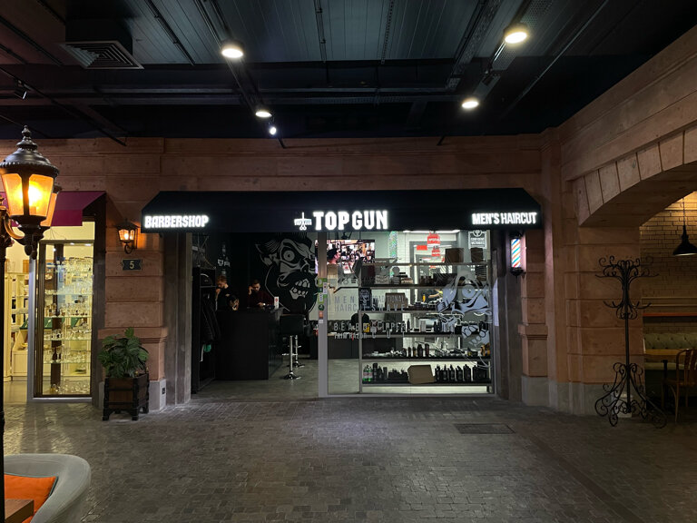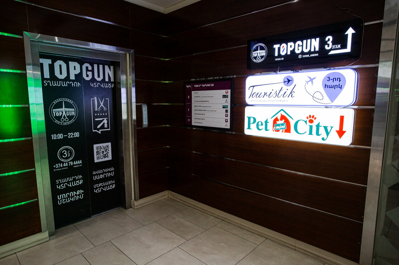 Барбершоп находится в Ереване по адресу: проспект Аршакуняц, 34/3, на третьем этаже. Работает ежедневно с 10:00 до 22:00. Записаться на стрижку или другую услугу можно по телефону +374 44 794444. Подробная информация представлена на сайте https://topgun.am/. Для определенных категорий клиентов в барбершопе действует льготная стрижка.