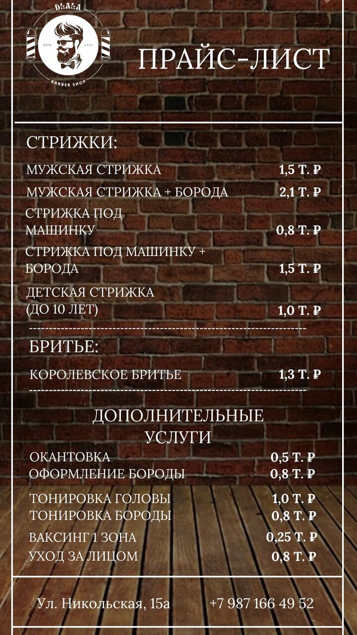 Основной перечень услуг включает мужские и детские стрижки, а также услуги детской парикмахерской. Для комфорта клиентов в барбершопе действует предварительная запись. Салон работает ежедневно с 10:00 до 21:00. Для связи и записи предусмотрен телефон +7 (987) 166-49-52. Более подробную информацию можно найти на сайте барбершопа по адресу https://dlalabarbershop.clients.site/.