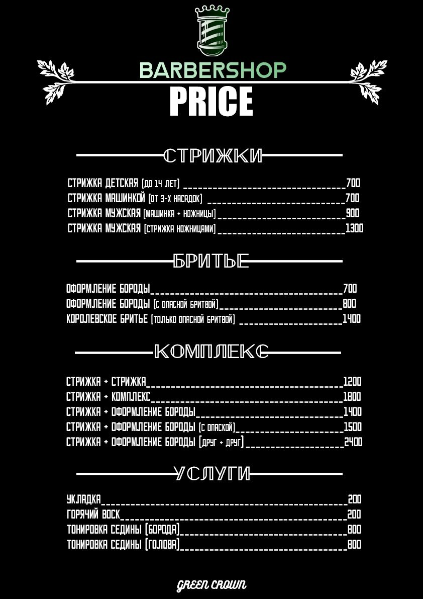 Очень понравился барбешоп Green Crown! Пользуюсь услугами уже больше года и хочу отметить постоянное и отменное качество обслуживания. Хорошая атмосфера! Хочется отметить барбера Богдана, лично мне нравится его работа. Желаю развития и успехов! Однозначно рекомендую!