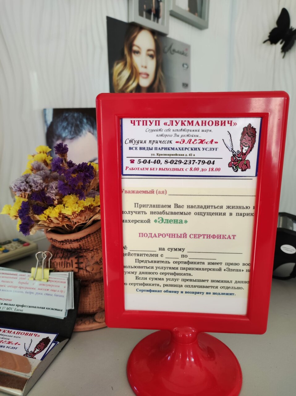 Студия причесок Элена работает ежедневно с 08:00 до 18:00. Для удобства клиентов доступна услуга предварительной записи, а также предлагается льготная стрижка. Связаться с салоном можно по телефонам: +375 21 395-04-40 и +375 29 237-79-04.