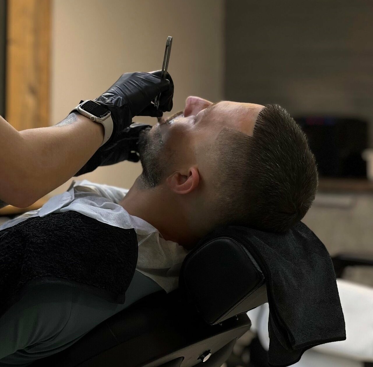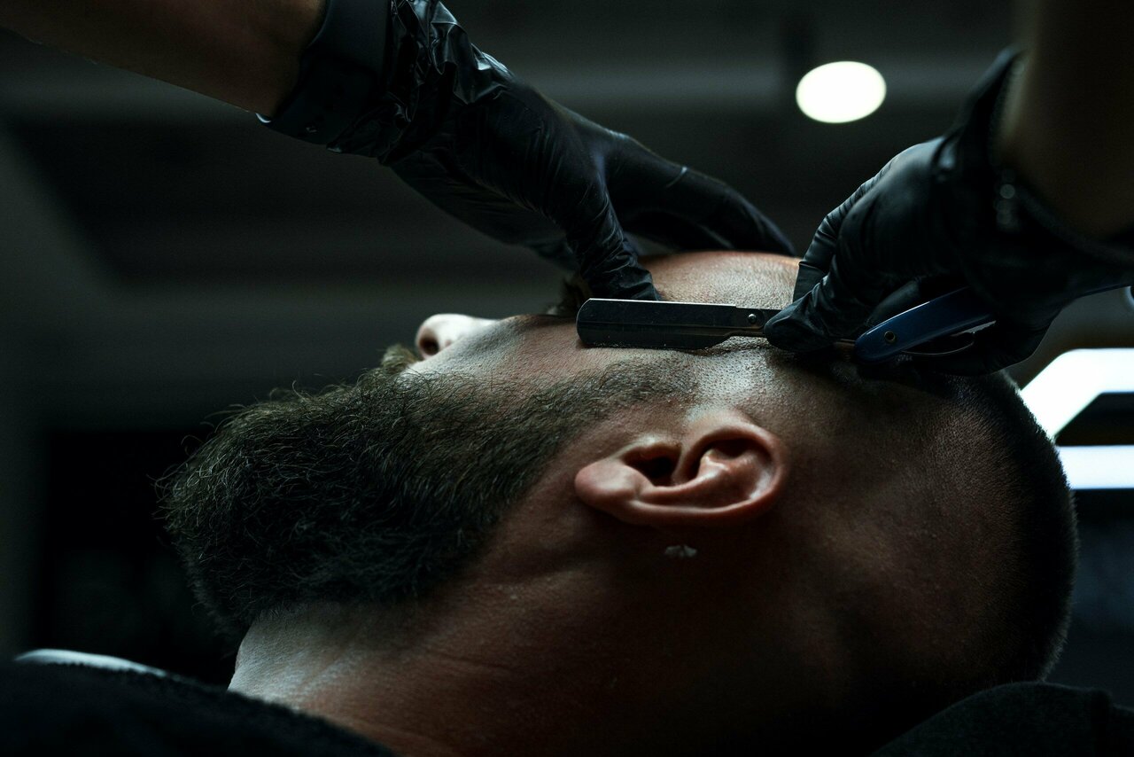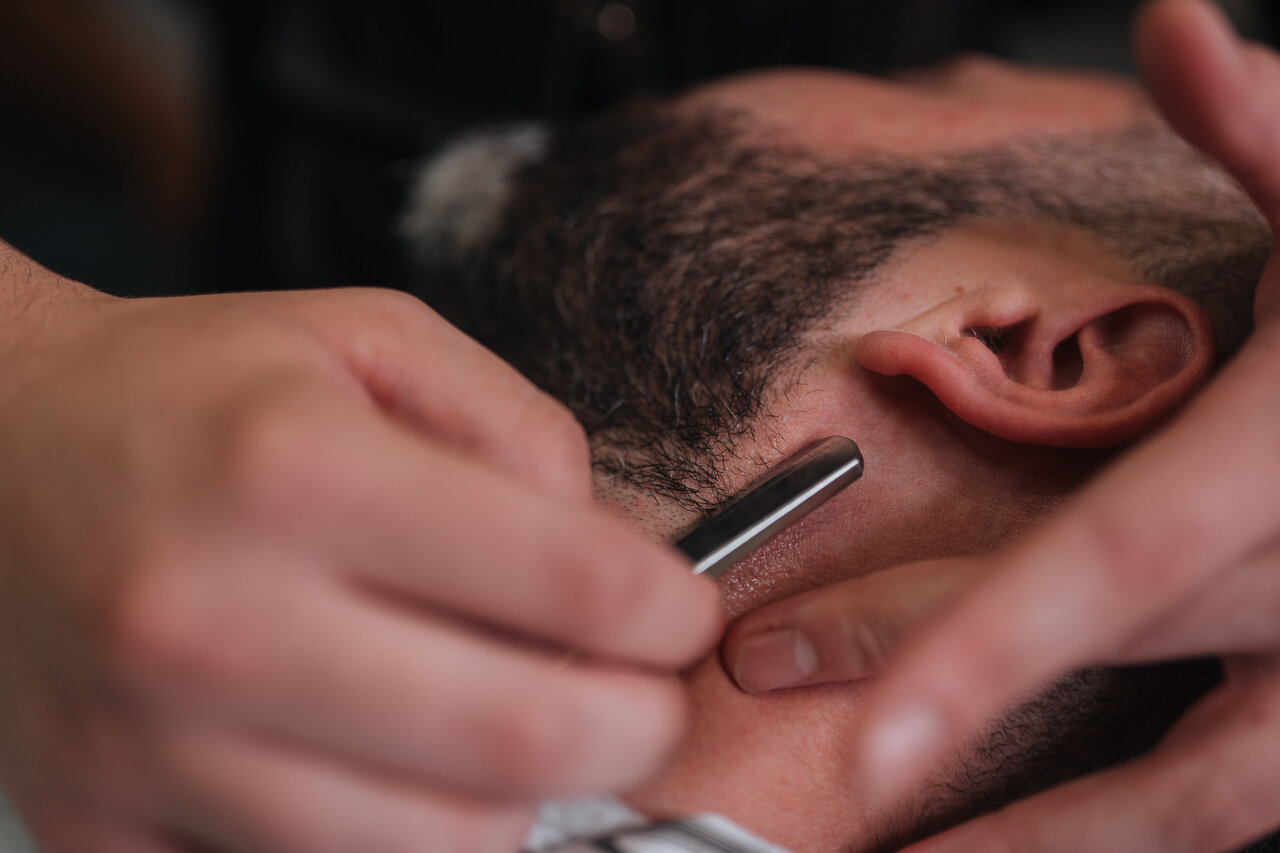 Классическое бритье опасной бритвой - шаветт с одноразовым лезвием, распаривание горячим полотенцем с использованием эфирных масел, лёгкий массаж лица, охлаждающий компресс в конце процедуры