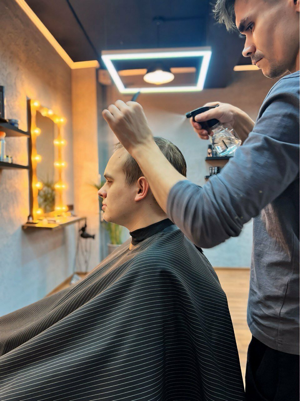 Окантовка – это процесс создания чётких линий по контуру вашей стрижки. Барбер аккуратно обрабатывает волосы вокруг ушей, шеи и бакенбардов, чтобы придать им аккуратный вид. Это как финальный штрих, который делает вашу прическу идеальной!