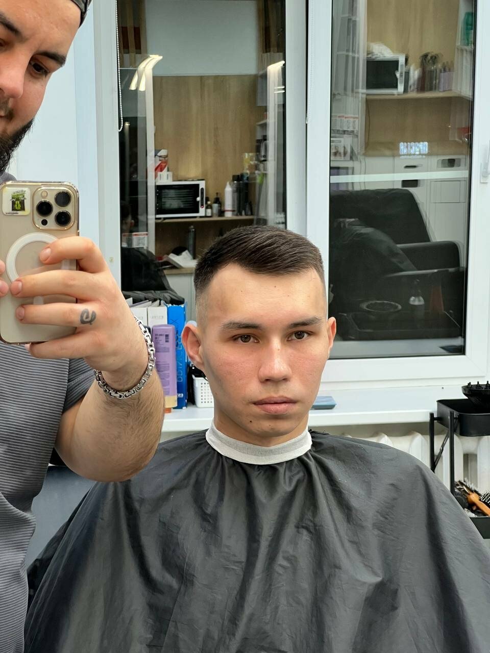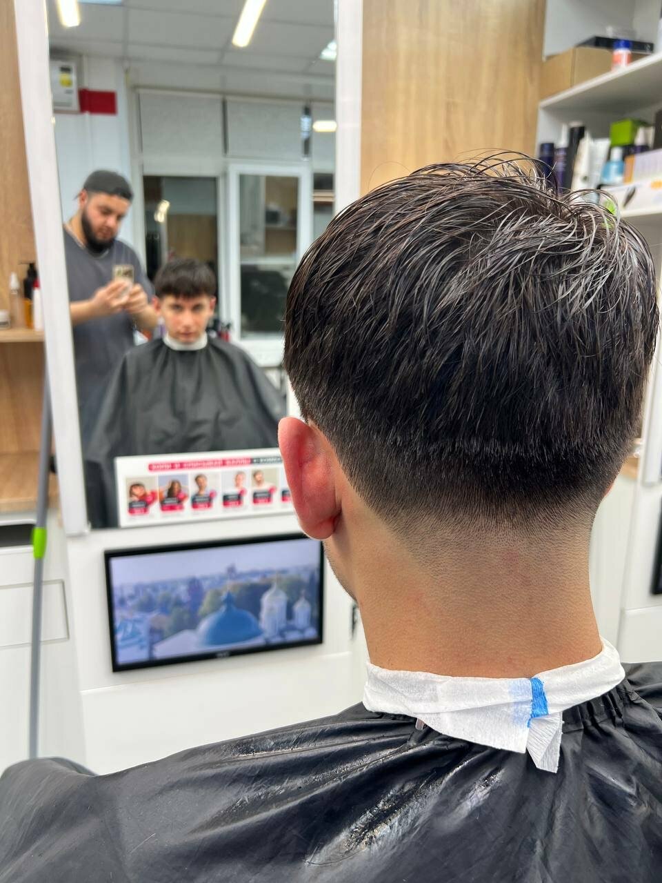 Просил оставить височную часть вертикальный, даже показал на парикмахере,, но испортил всё закруглив, как на колобке. Фамилия парикмахера Муразов, не пользуйтесь его услугами!!!