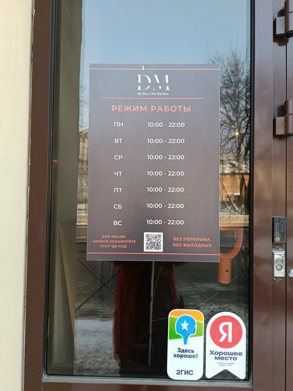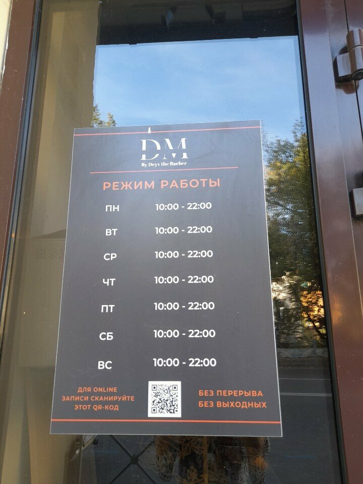 DM Barbershop работает ежедневно с 10:00 до 21:00. Для записи и связи с администратором доступны телефоны: +7 (953) 485-26-15 и +7 (843) 214-21-00.