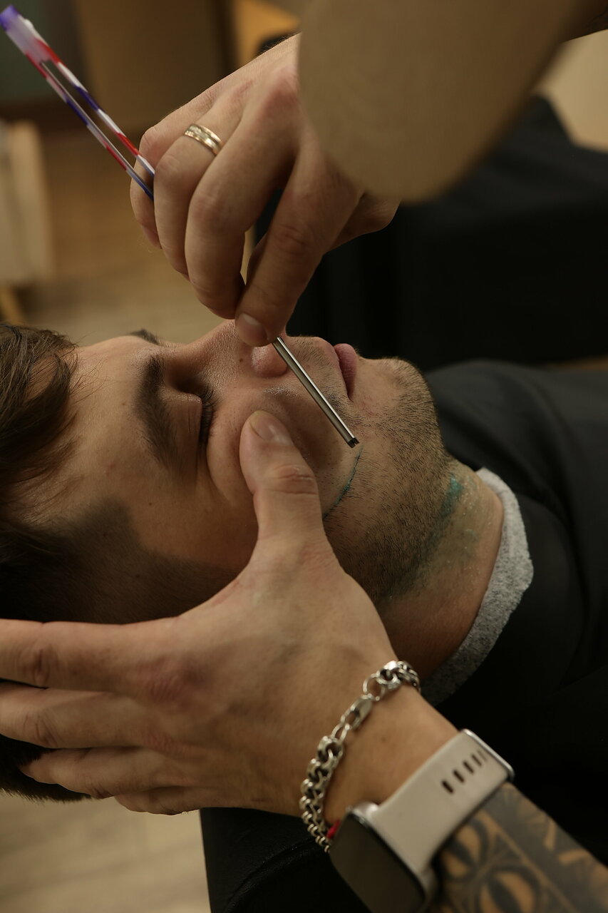 Создание формы бороды с использованием машинки, ножниц и лезвия. Включает в себя: Распаривание бороды горячим полотенцем(с использованием эфирных масел), легкий массаж лица, охлаждающий компресс.