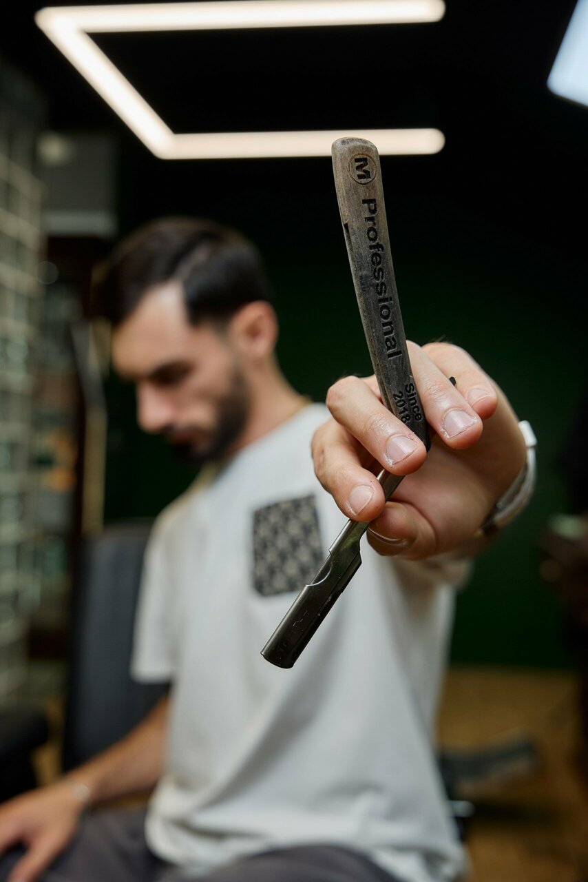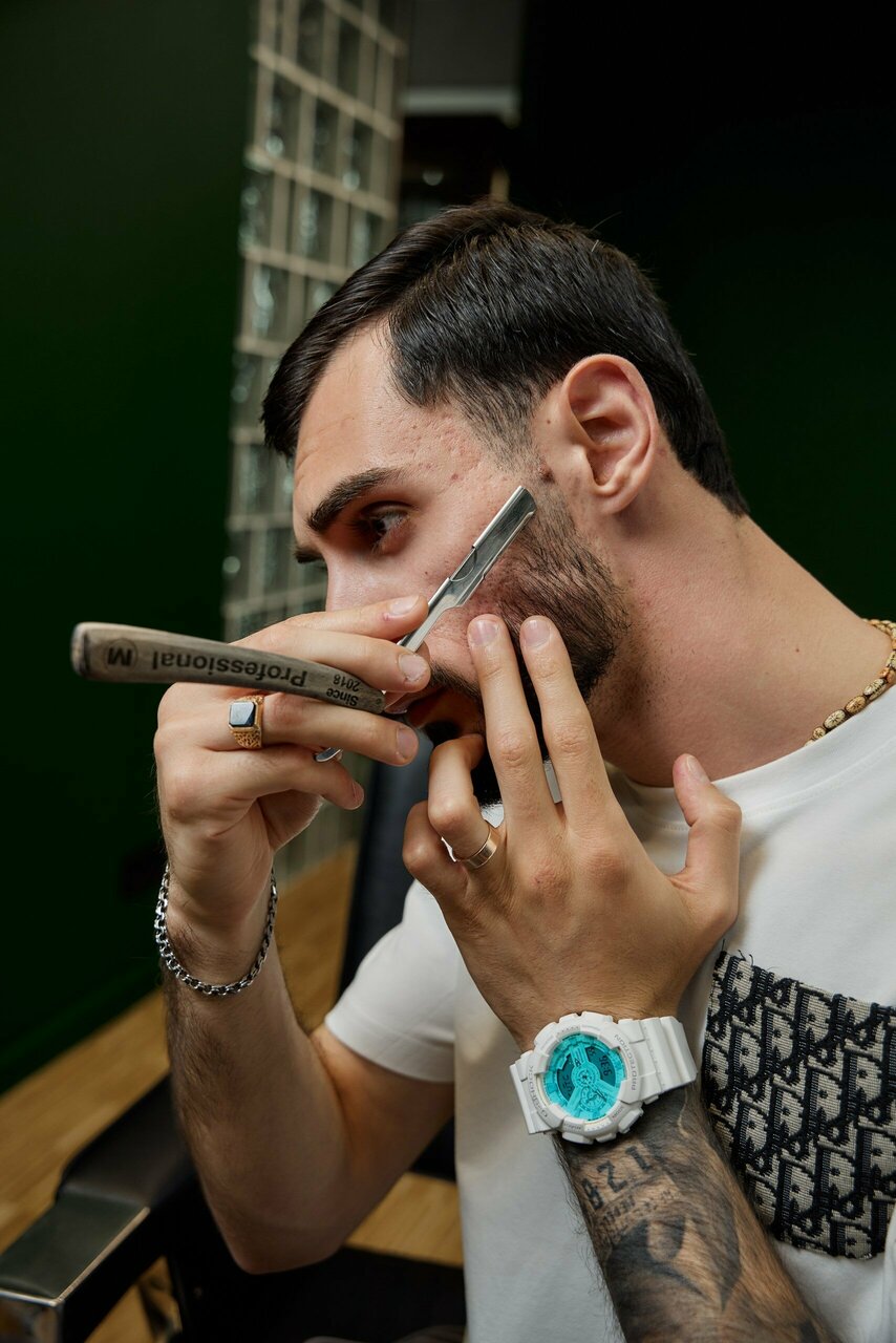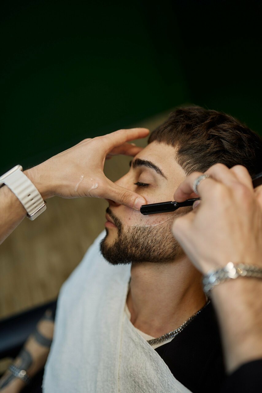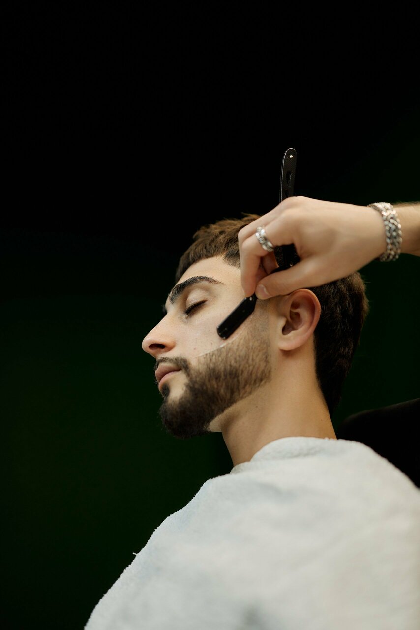 Бритье опасной бритвой. В стоимость услуги входит: распаривание лица, бритье, обработка профессиональными средствами после бритья.