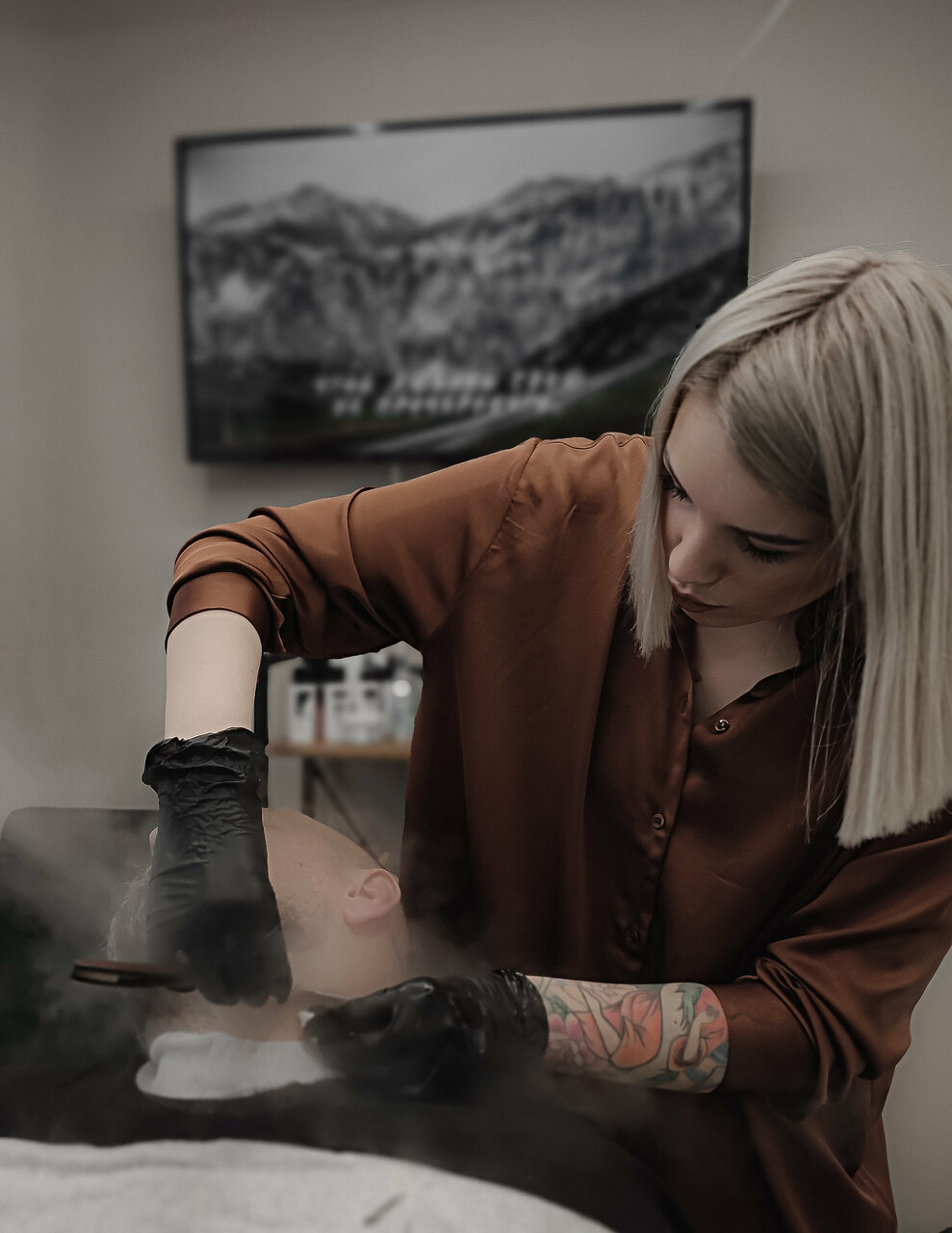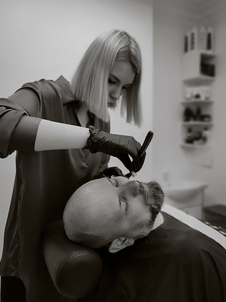 Распаривание кожи головы тёплым компрессом, бритье выполняется опасной бритвой.
