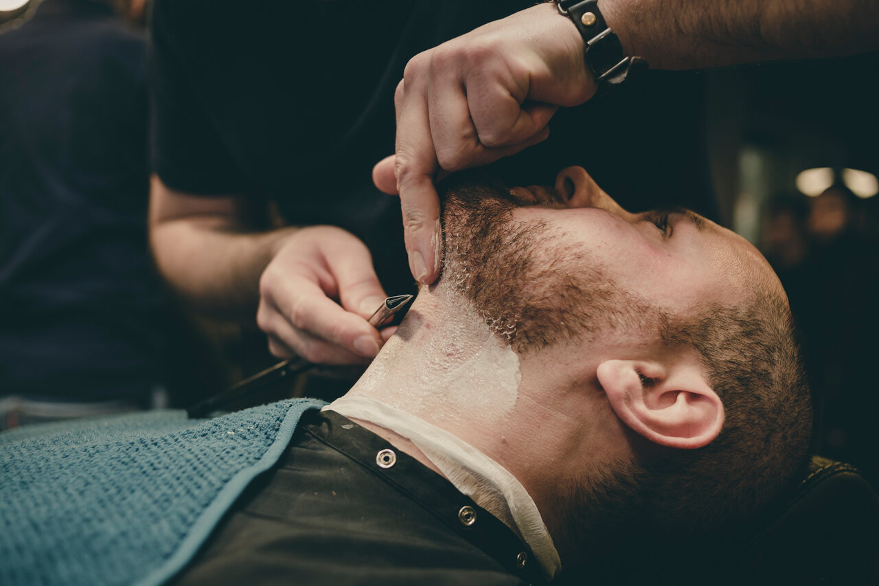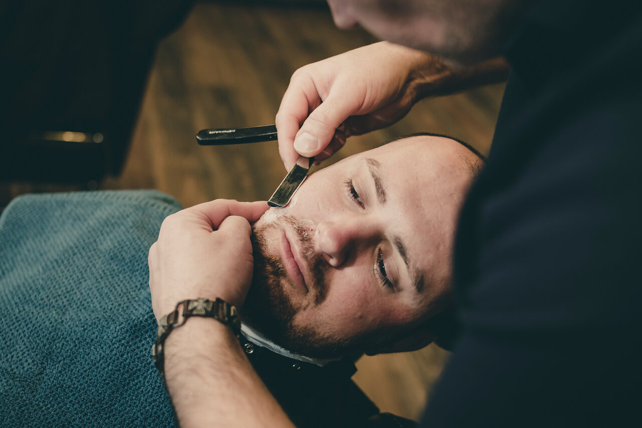 Королевское бритьё — это не просто бритьё опасной бритвой, барбер проводит настоящий многоступенчатый ритуал: распаривание кожи, смягчение маслом, нанесение густой, ароматной пены, непосредственно бритье и холодный компресс, который предотвратит разд