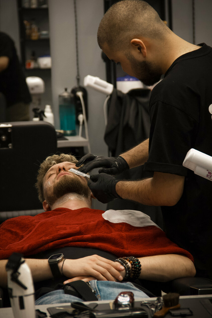 Королевское бритьё — это не просто бритьё опасной бритвой, барбер проводит настоящий многоступенчатый ритуал: распаривание кожи, смягчение маслом, нанесение густой, ароматной пены, непосредственно бритье и холодный компресс, который предотвратит разд