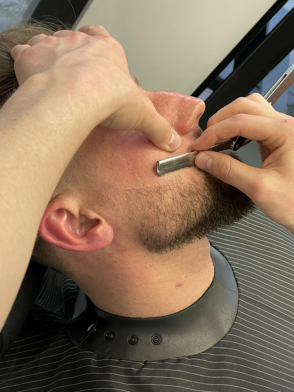 Бритье лезвием лица по росту волос с использованием горячего и холодного компрессов.