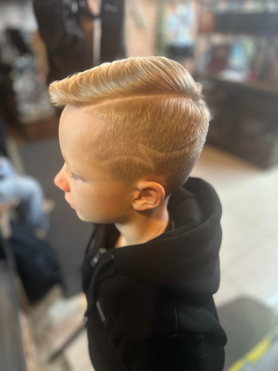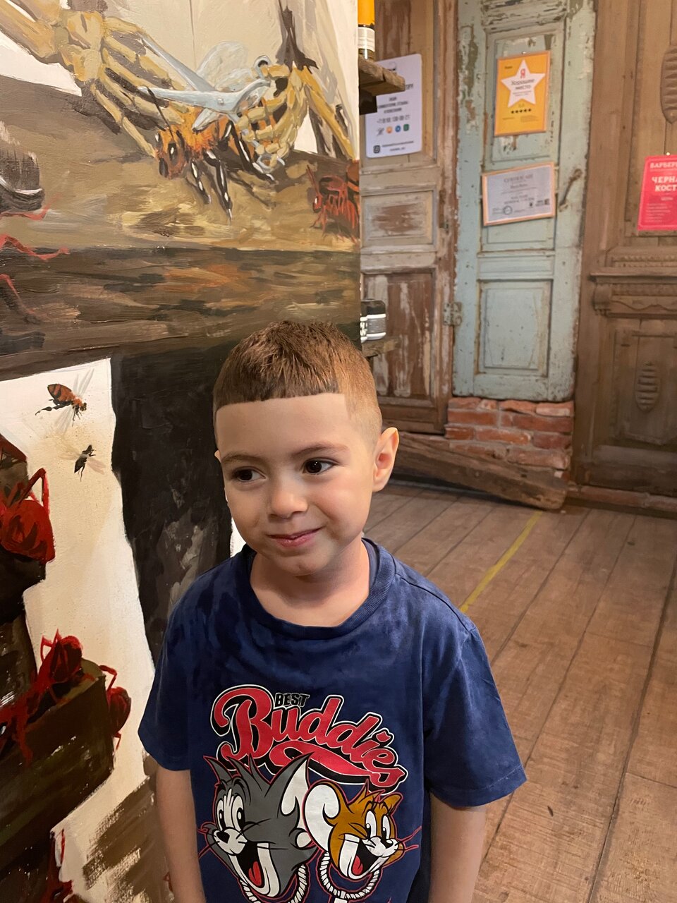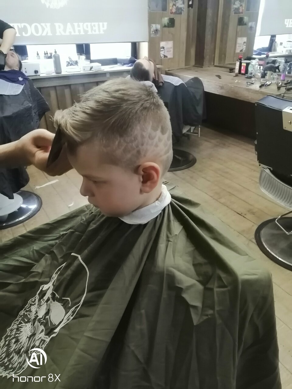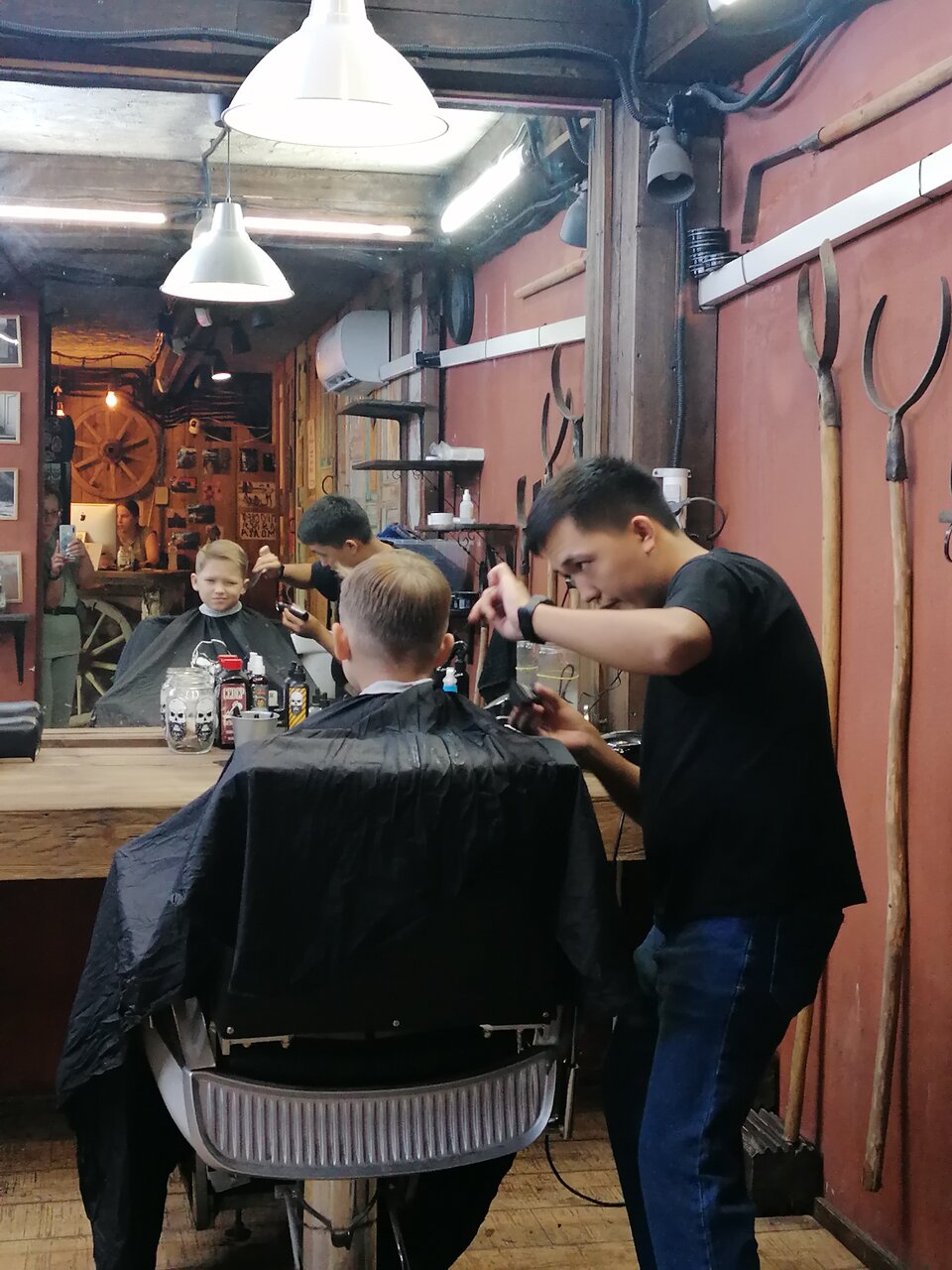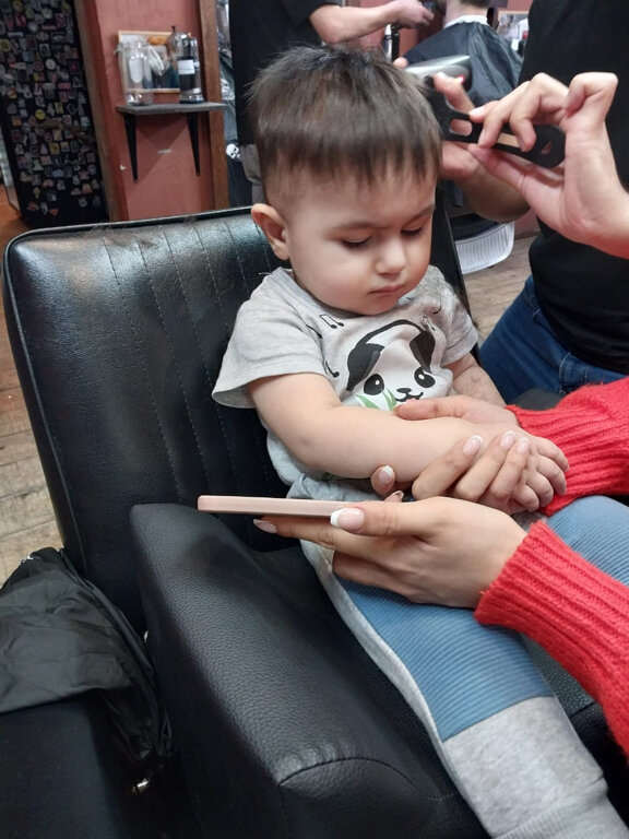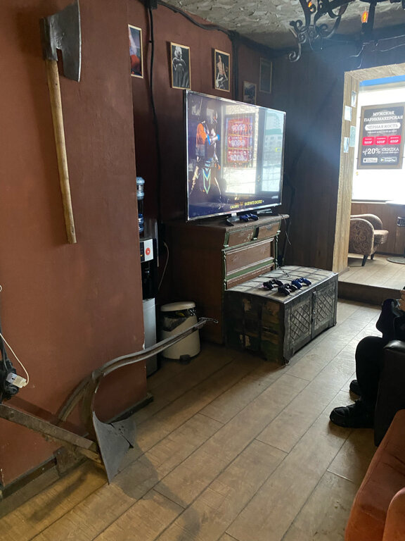- Интересный реквизит в оформлении; Комната ожидания с огромным экраном и игровой приставкой; Возможность оплаты картой (по данным одного отзыва); Приятная, брутальная атмосфера и интерьер; Мастера находят общий язык с детьми.