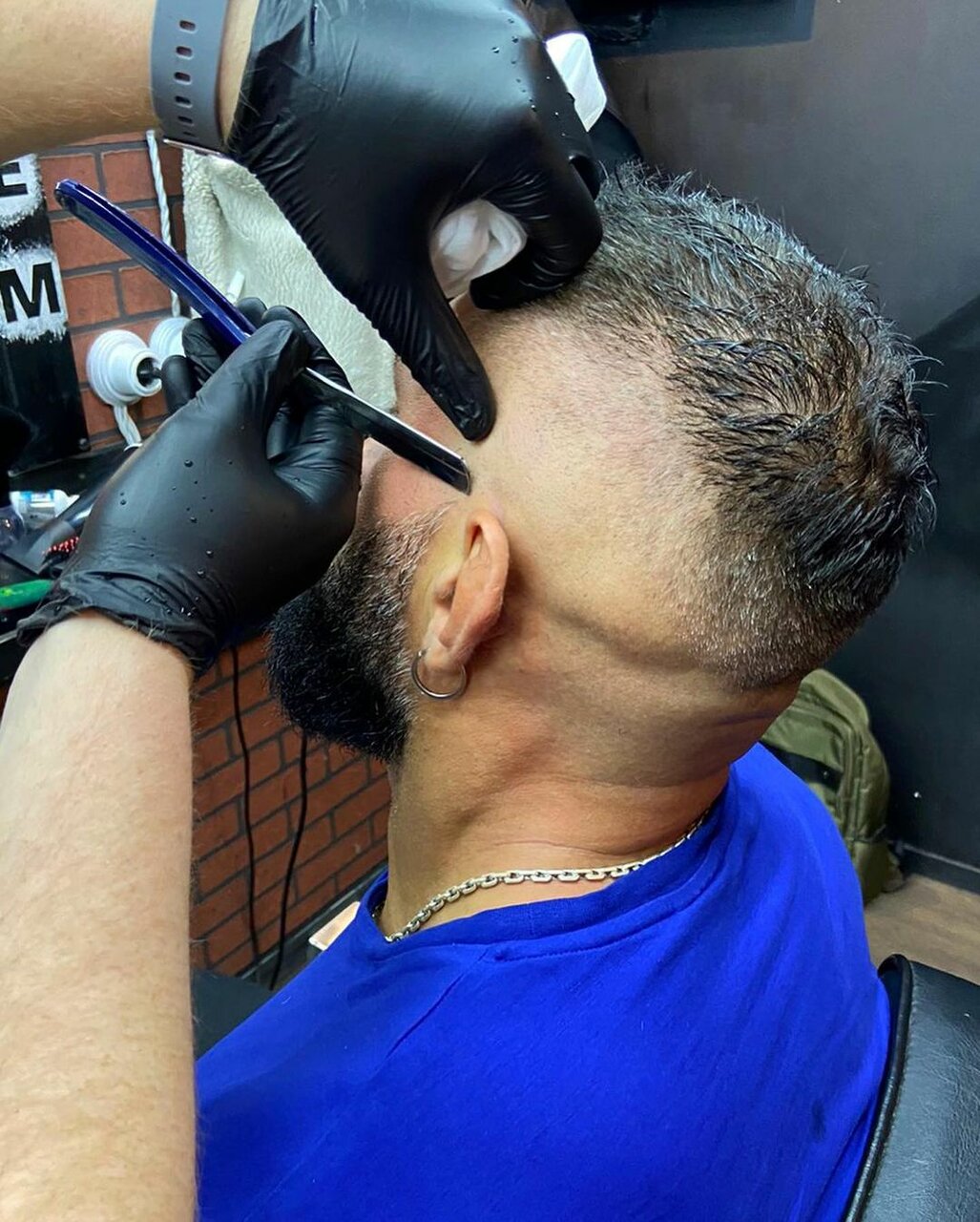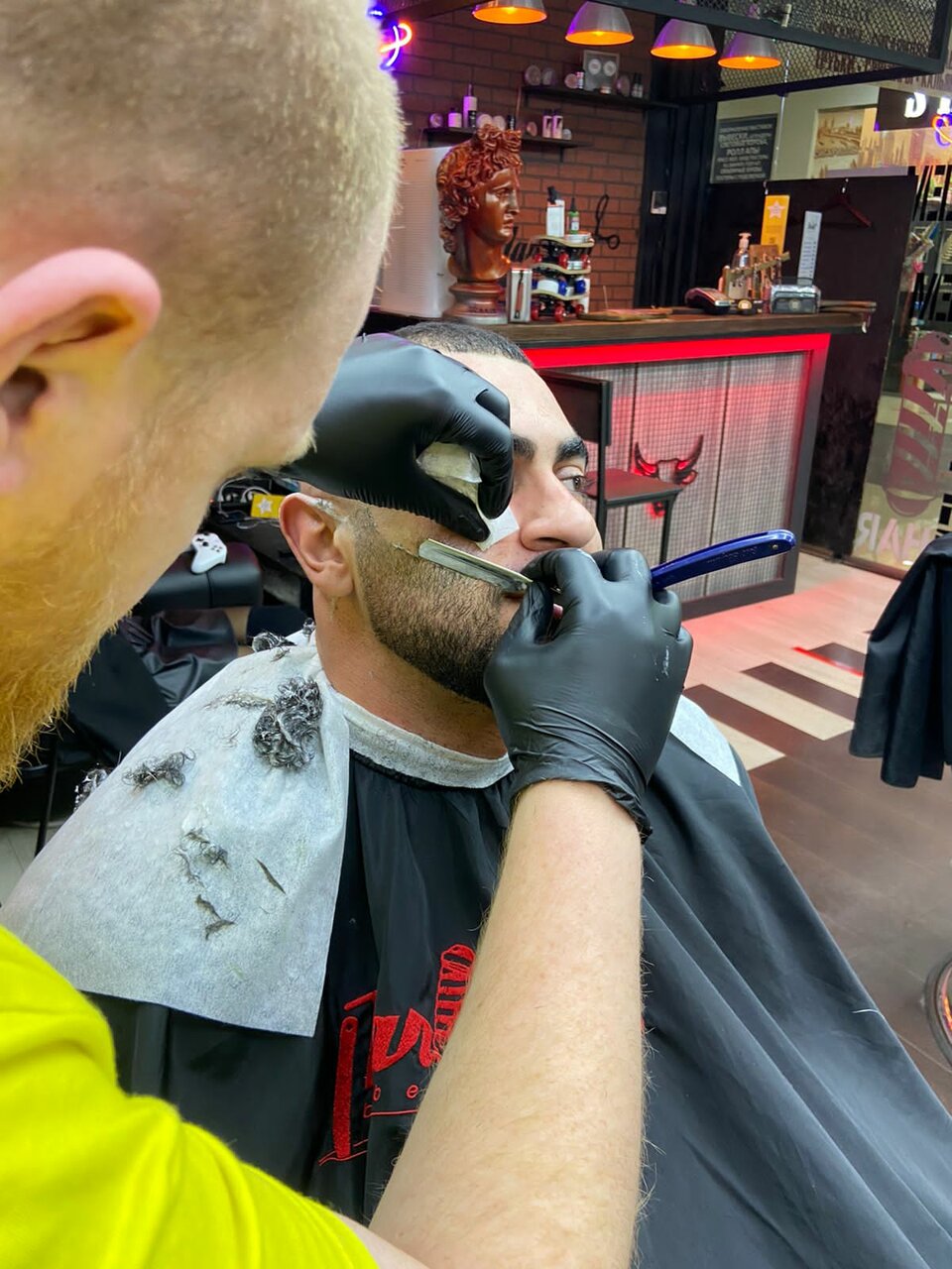 Бритье одноразовой опасной бритвой. Услуга проходит в несколько этапов: распаривание кожи головы горячим полотенцем, нанесение средства для бритья, сам процесс бритья и закрытие пор холодным полотенцем. Преимущество этой процедуры в долговременном эф