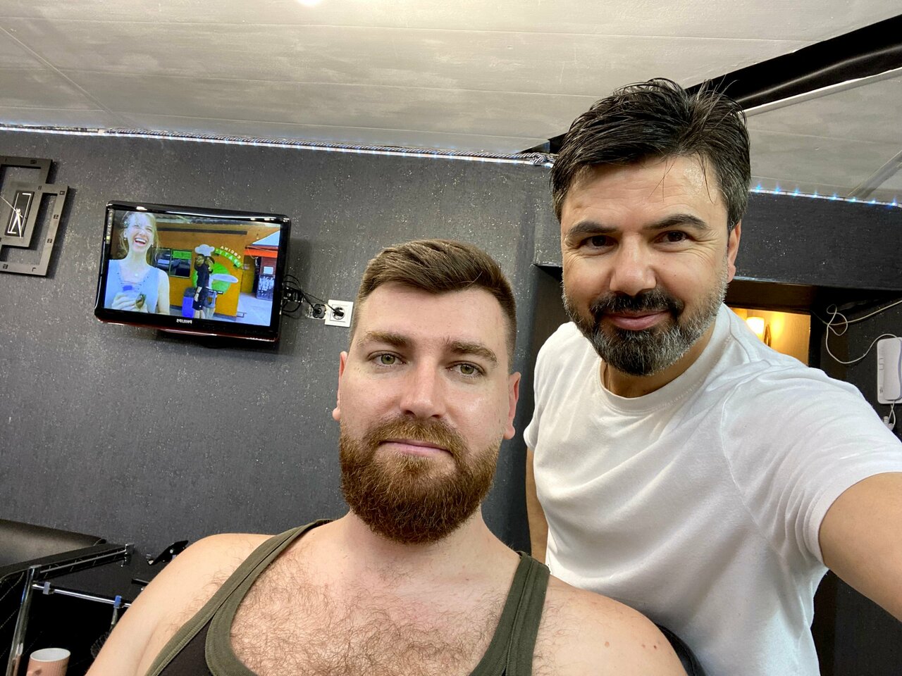 Девушка мастер- молодец, аккуратно работает. Али как всегда на высоте, обсудили форму усов и бороды , дал советы по уходу.