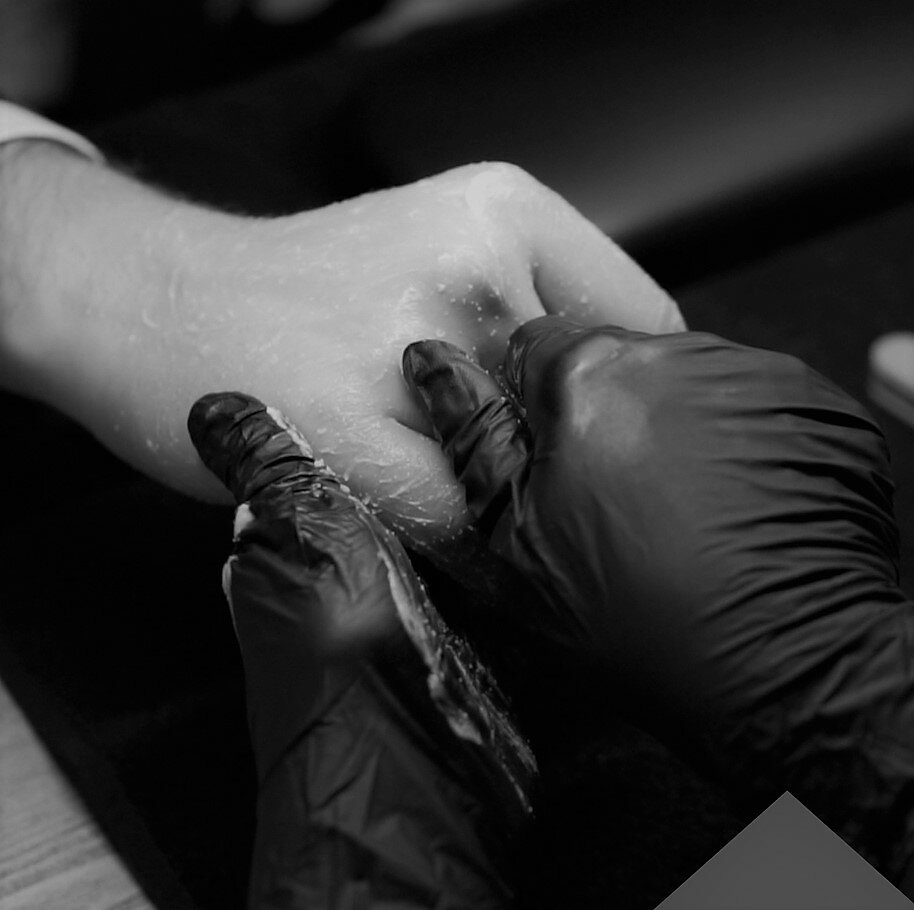 Мастер обеззараживает руки/ноги Клиента, наносит специальный крем, после чего погружает их в ванночку с расплавленным парафином и оборачивает в одноразовый полиэтилен и махровое полотенце на 15 минЛечение трещин и шершавости, снятие боли в суставах
