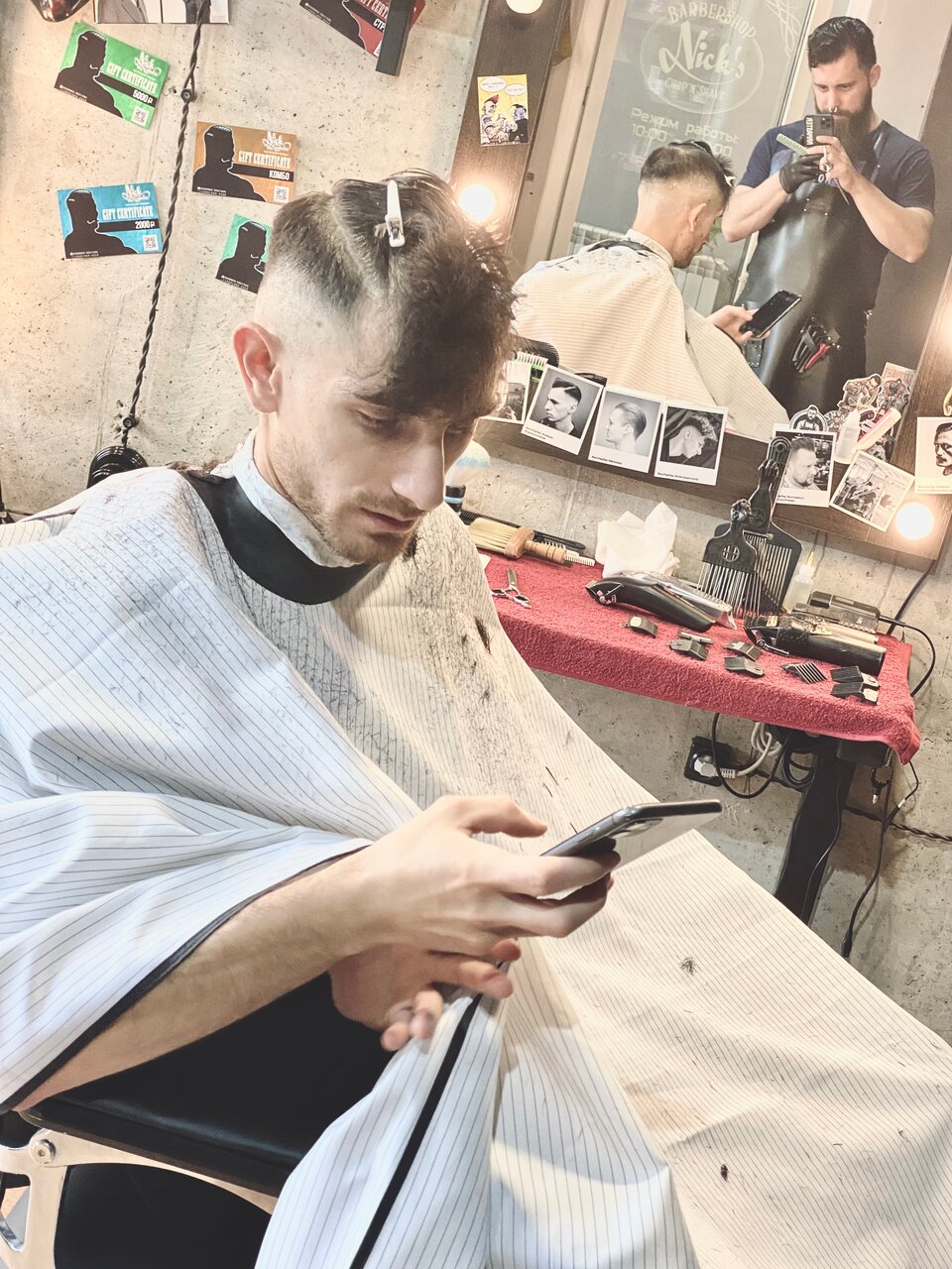 Ну в общем так. Зашел в парикмахерскую, меня встретили позитивно словами добрый день!. А откуда они знают, что у меня день добрый, следили за мной? Зачем-то спросили о том, какую я хочу стригу, вы что, не профи? Налили выпить. Тут спасибо, претензий нет. Барбер вел светские беседы, наверняка, чтоб отвлечь меня от процесса стрижки, но мне понравилось. Я еще не успел уйти, уже начали подметать.. ну конечно.. чтоб смешать мои волосы с волосами других клиентов, чтоб я не смог опредклить свои, и потом меня прокляли (когда я вышел из шопа- чихнул. Сглаз заработал походу). В общем, Нику и команде огромное спасибо))