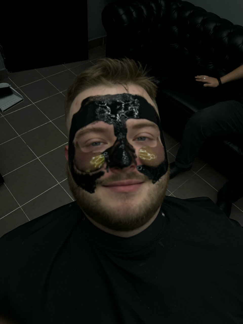 Обрабатываем лицо хлоргексидином, легкими массажными движениями наносим скраб, распариваем лицо и наносим чёрную маску.