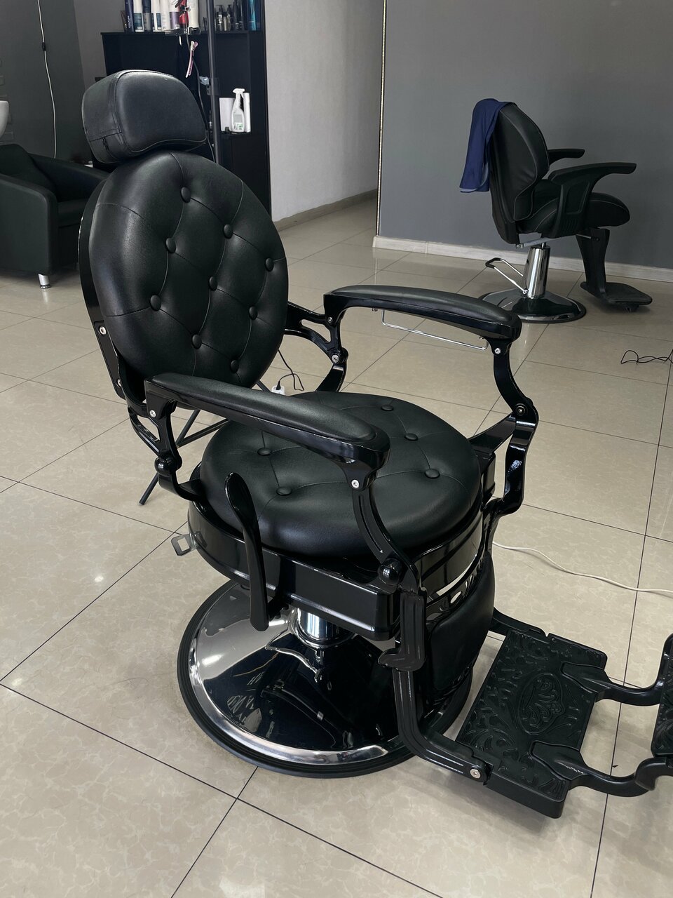 Мужская удлиненная просто совершенно стрижет. И кресло крутое кожаное