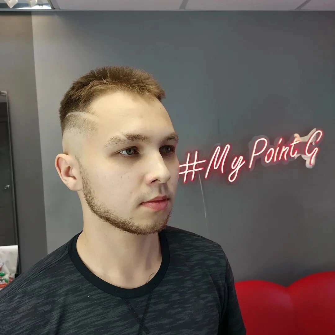 Любая мужская стрижка с элементами 'фейд'. При стрижке помимо ножниц и машинки с различными насадками выполняется плавный переход при помощи шейвера (ноль) и триммера.