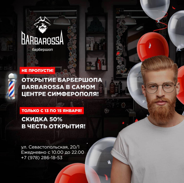 BarbarossA работает ежедневно с 10:00 до 21:00. Узнать более подробную информацию или записаться можно по телефону +7 (933) 441-82-93 или на сайте https://barbarossa.top/.