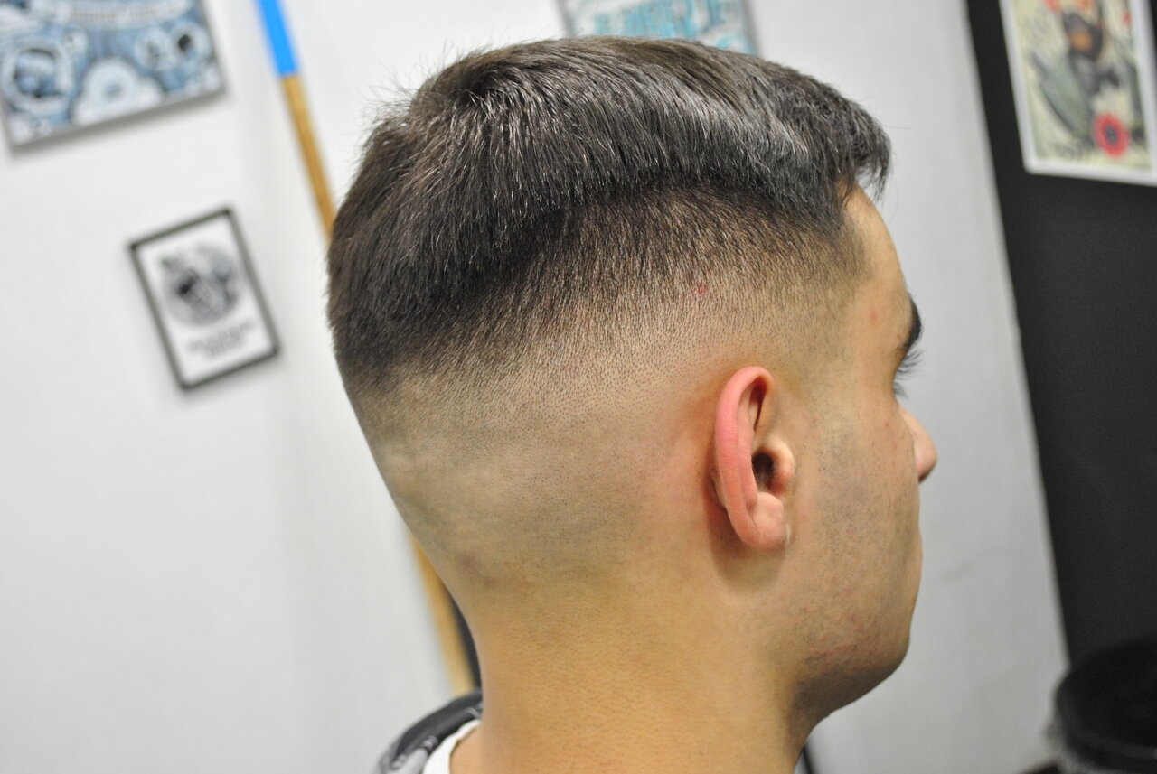 Стрижка машинкой выполняется без использования ножниц, височные зоны стригутся тоже насадкой (переход с 0 относится к услуге «Мужская стрижка»).