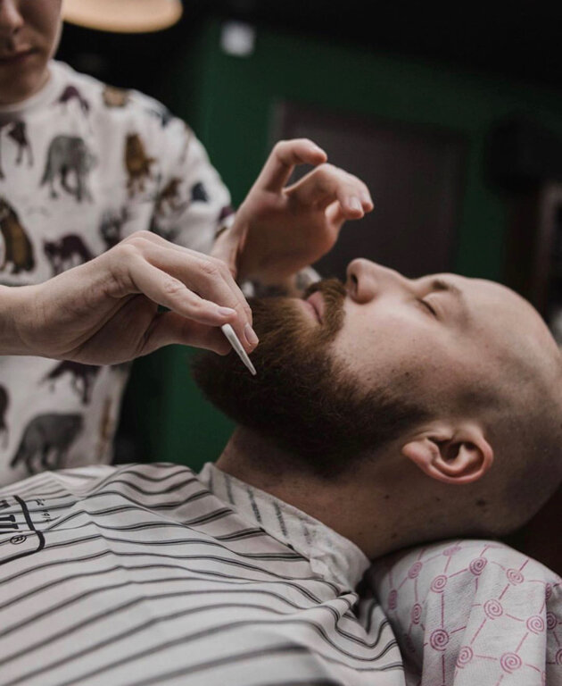 Барбер производит оформление краевой линии роста волос на лице, коррекцию длины волос с использованием машинки, одноразовых лезвий, горячих полотенец и средств до и после бритья.