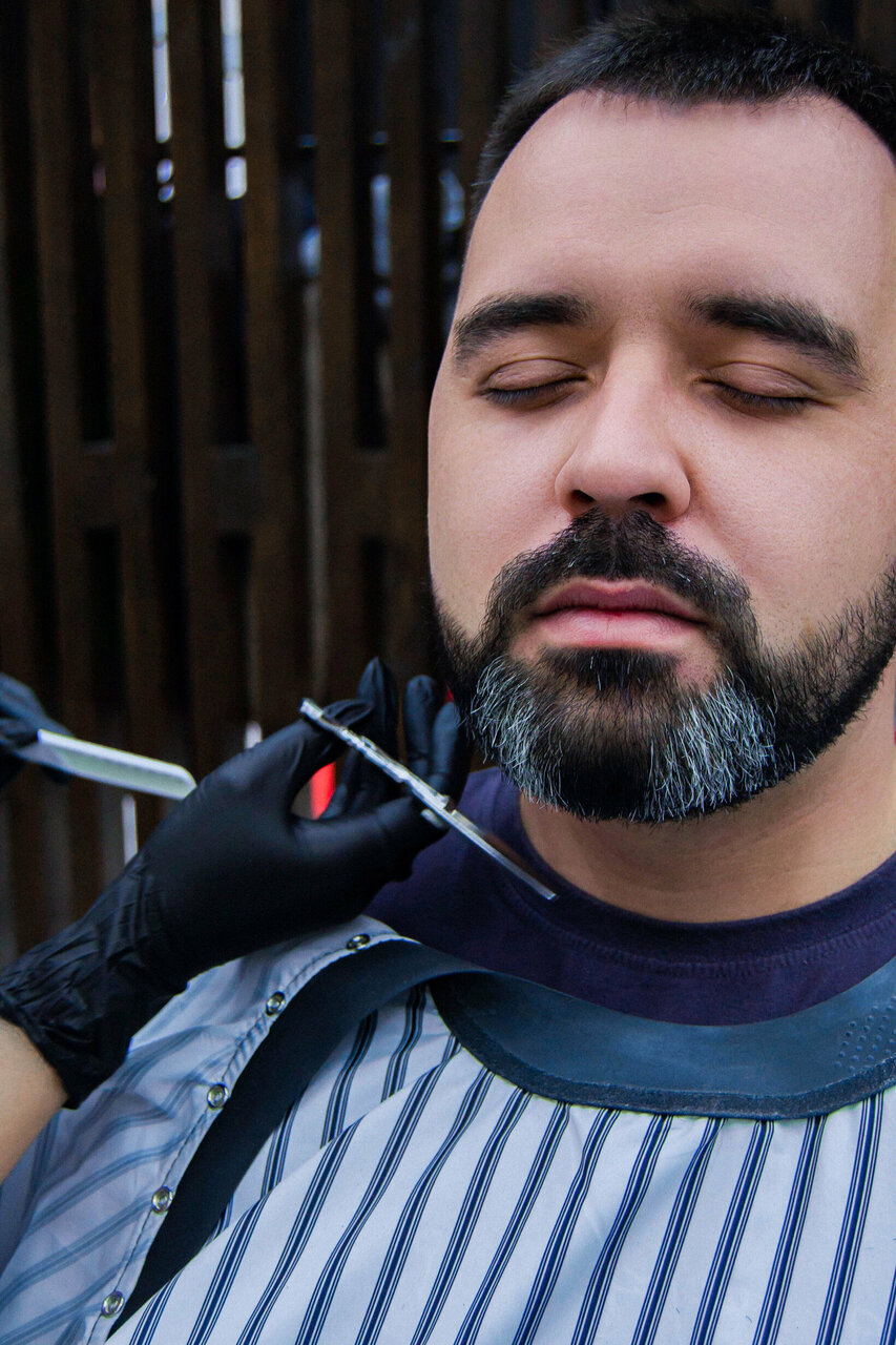 Прокрашивание непигментированных волос на бороде с использованием тонировочного средства. Тонировка не содержит аммиак и не портит структуру волоса. Эта процедура позволяет сделать цвет бороды ровным и однородным и улучшить ее качество