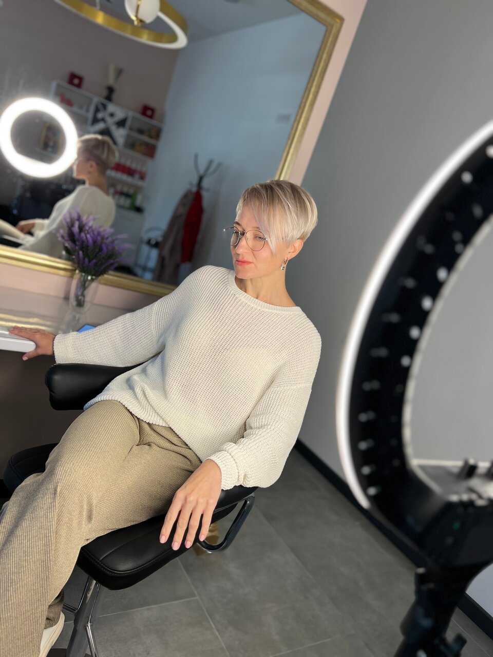 - Стильный дизайн и уютная атмосфера; Интерьер на высоком уровне.; Хороший сервис (предложение чая/кофе); Комфортные условия; Высокое качество услуг (стрижки, окрашивания)