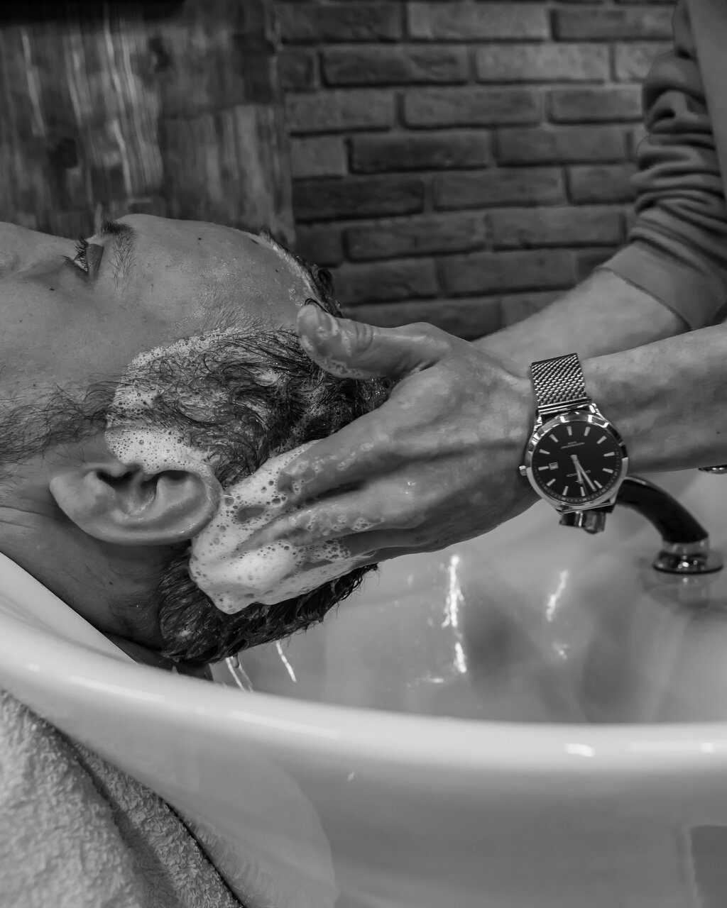 1. Побреем налысо. Сделаем это аккуратно.2. Пострижем бороду, подберем форму и длину бороды, чтобы в уходе и носке не было дискомфорта и образ был цельным.
