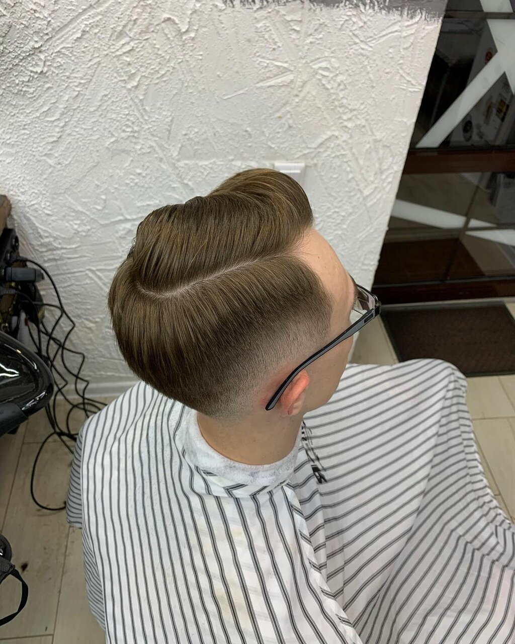 В процедуру стрижки машинкой 2-3 насадками включено: непосредственно стрижка машинкой под 2-3 насадки, мытье головы и сушка. К примеру, сверху 12 мм, а снизу 6 мм и для более плавного перехода используют насадку 9 мм.