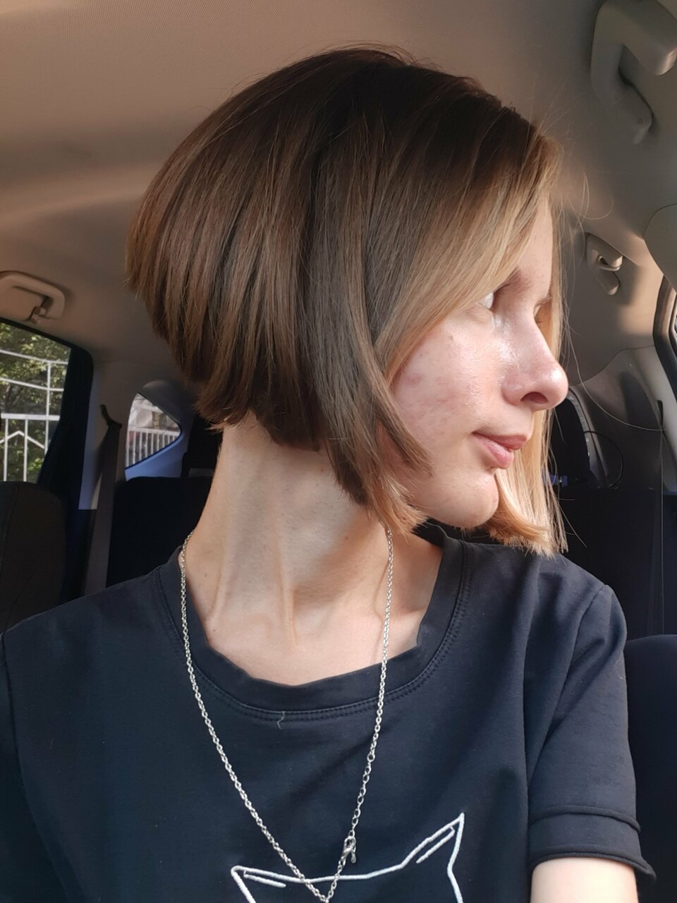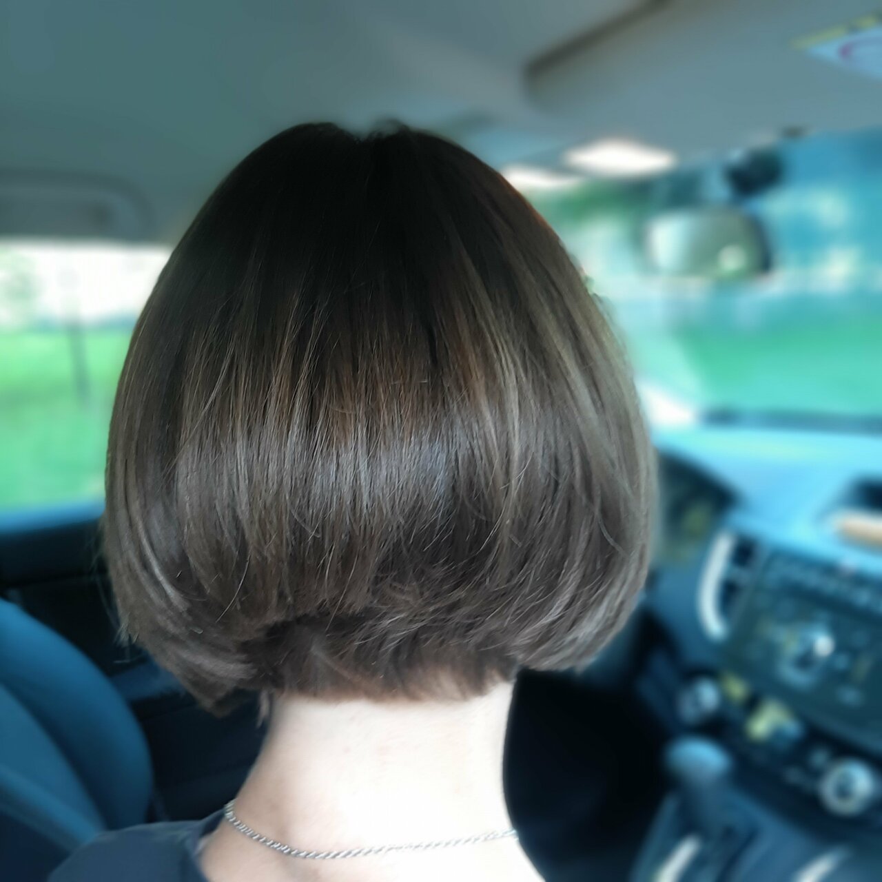 Это классический срез по одной горизонтальной линии, когда волосы красиво откинуты назад, а их концы лежат на спине ровной линией.