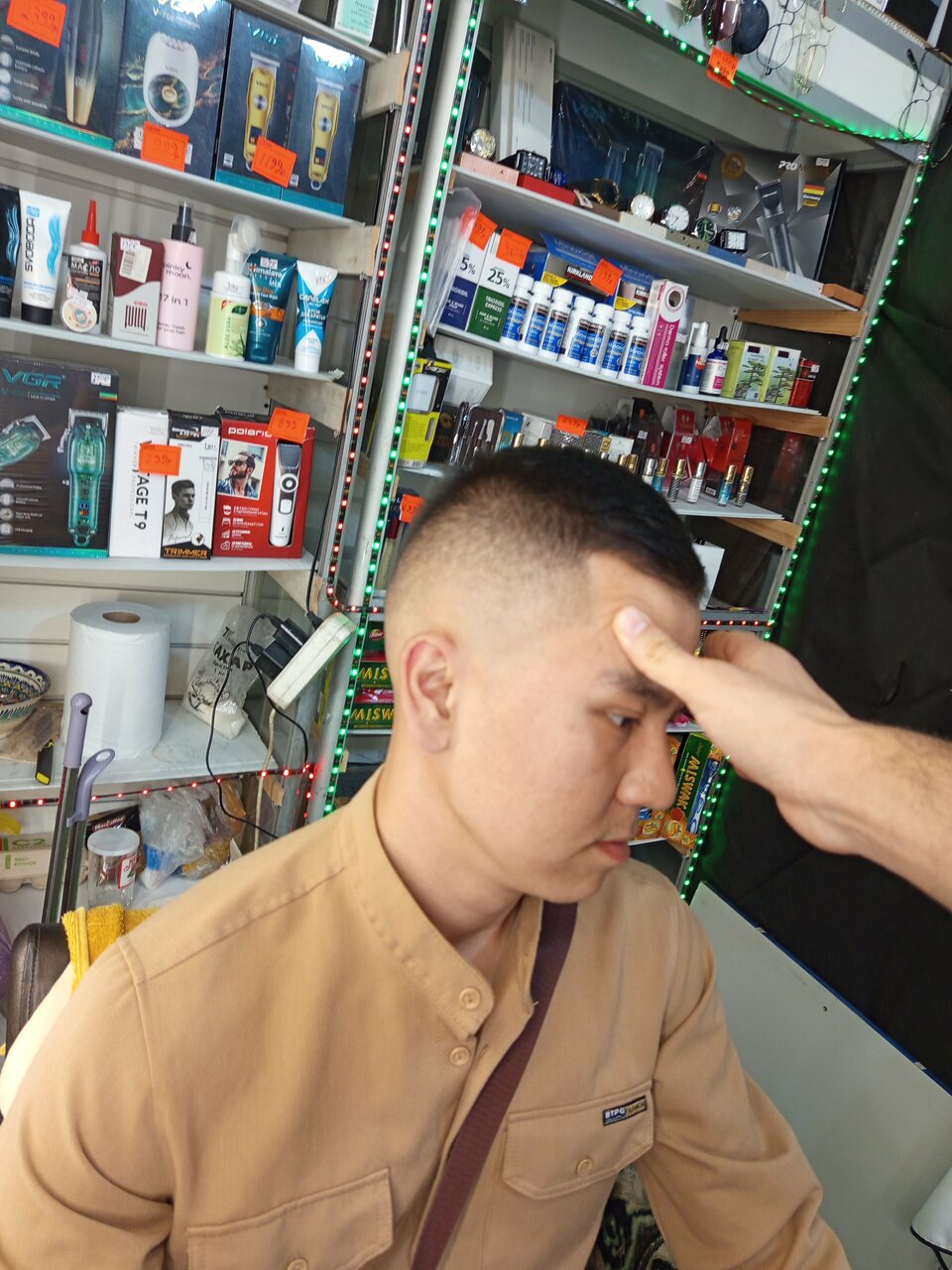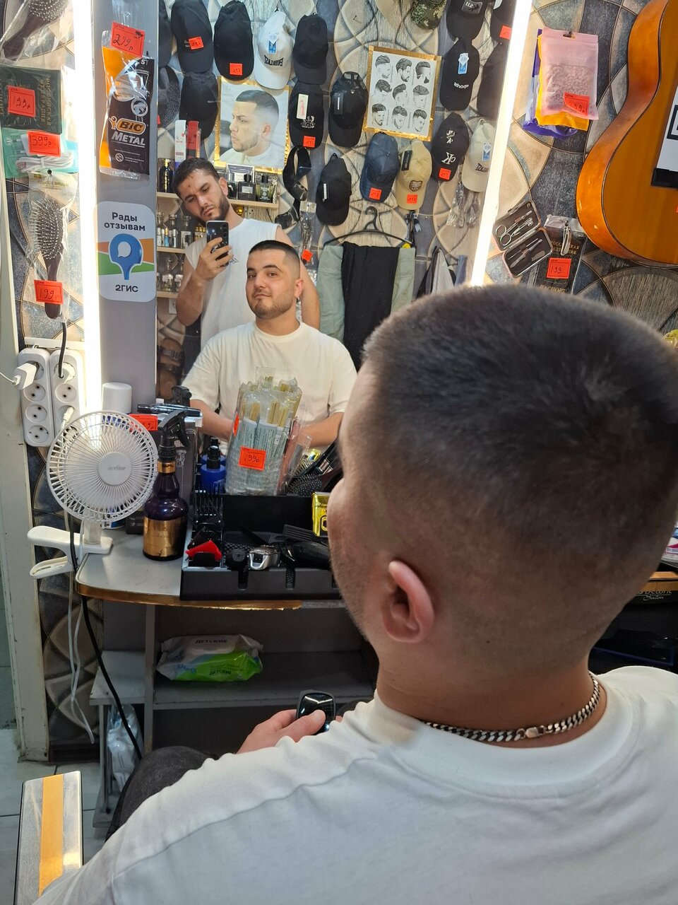 Подстригли более менее не плохо. Но есть минусы. Единственное не понравилось в стрижке то, как подстригли чëлку(часть волос постригли так, что осталось +-1 см, а часть просто слегка укоротили). Очень странный вход в ‘парикмахерскую’. Чтобы попасть в парикмахерскую, надо было зайти в продуктовый магазин, попросить кассира, чтобы он отвëл тебя к парикмахеру. Кассир заводит тебя за прилавок и ведëт в комнату, в которой грубо говоря бордак и там же тебя подстригают. Ценник в приложении Яндекс.Картах не актуален, мужская модельная стрижка стоит 400 рублей.
