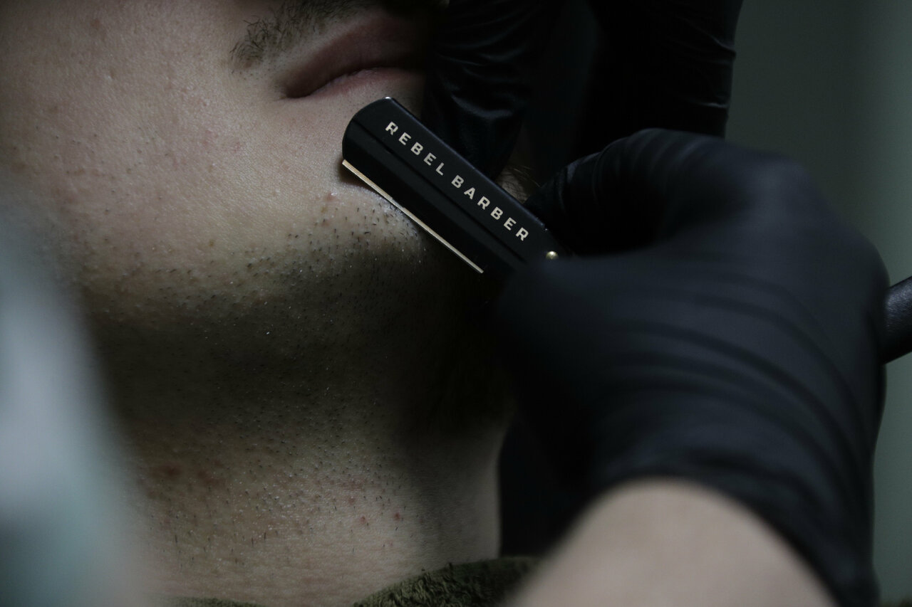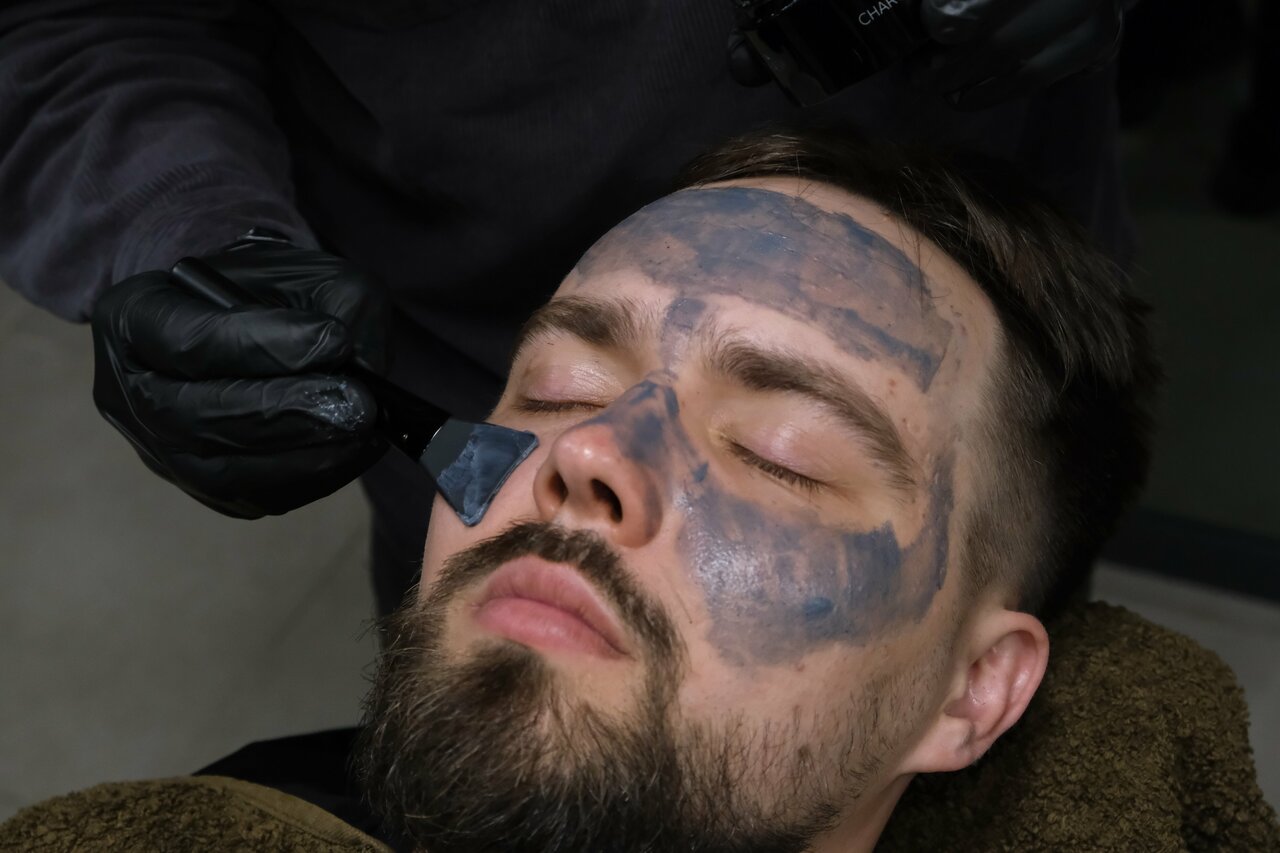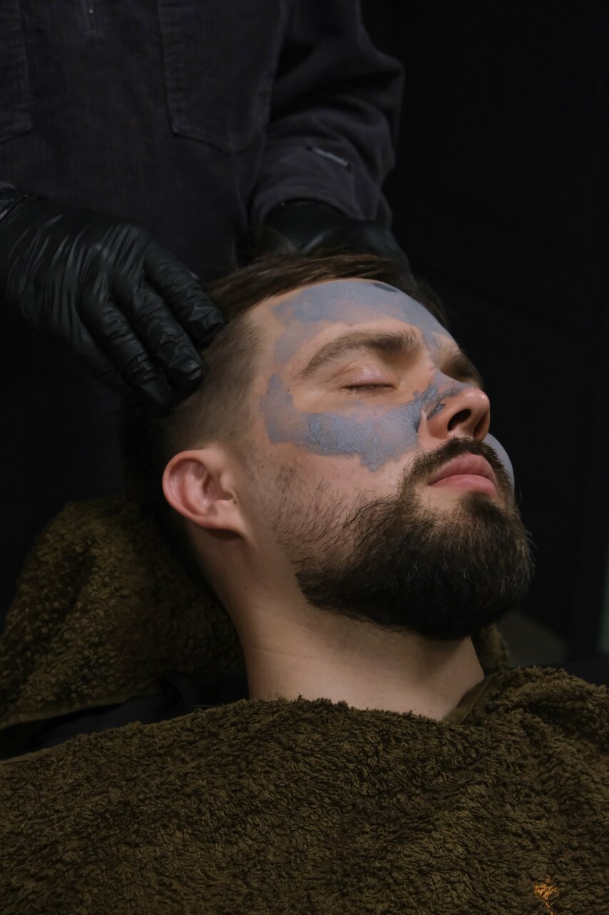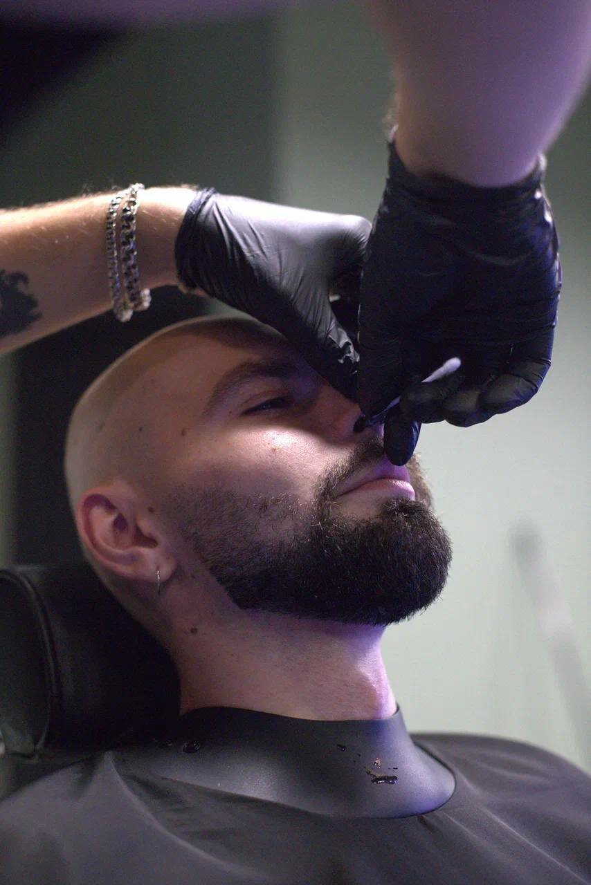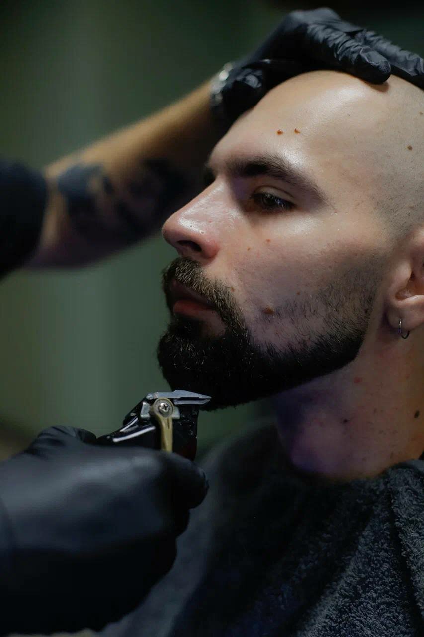 Процедура включает в себя бритьё лица с использованием триммера и электробритвы.