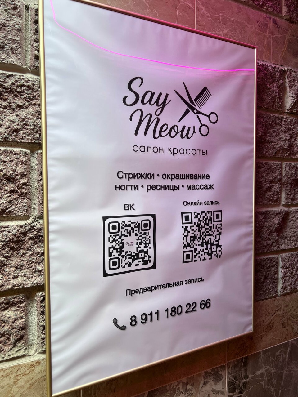 Помимо основных услуг, барбершоп предлагает стрижки для детей и льготные стрижки. Для комфорта клиентов работает система предварительной записи. Saymeow открыт ежедневно с 11:00 до 20:00. Связаться с салоном можно по телефонам: +7 (911) 180-22-66 и +7 (999) 242-89-09.
