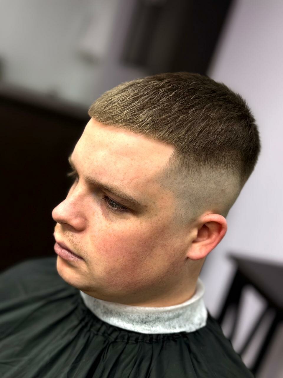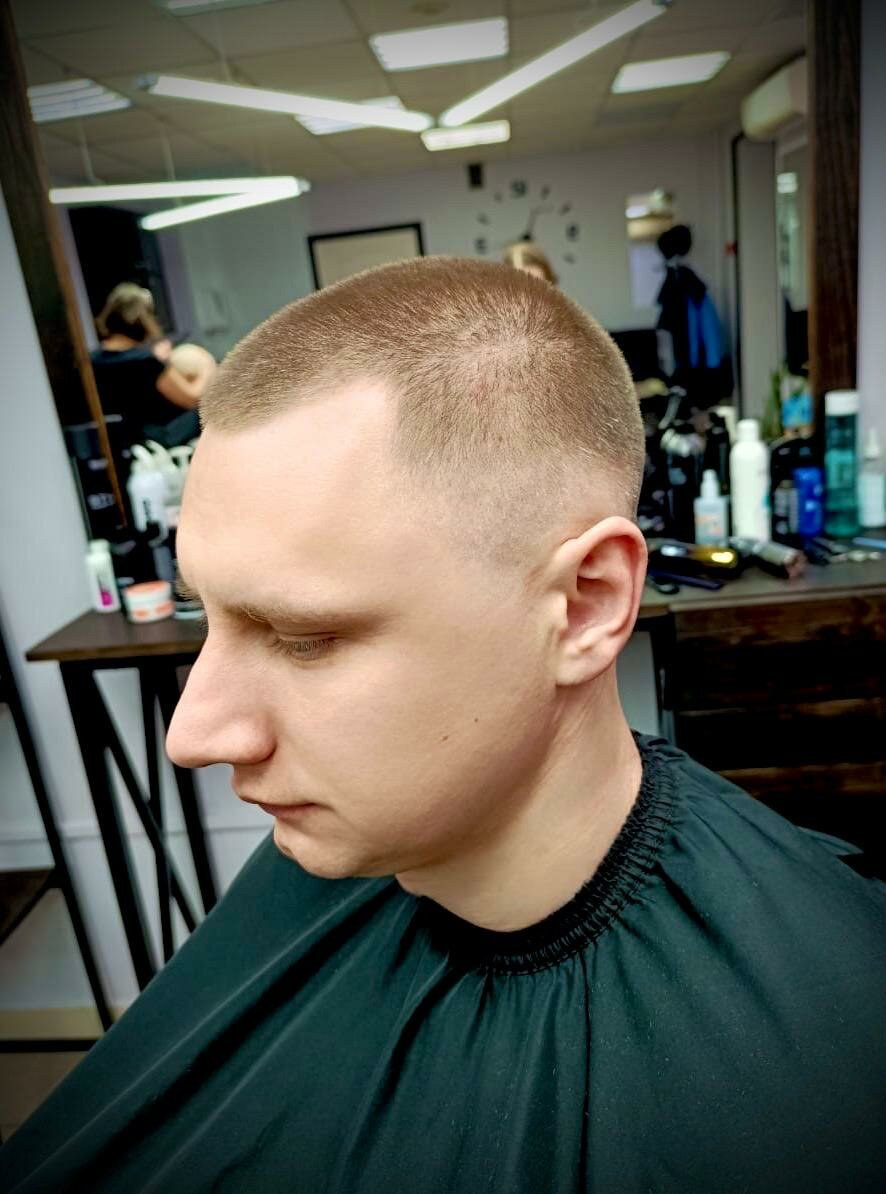 Стрижка машинкой без насадки. Длина волос 0.4-1,5 мм.