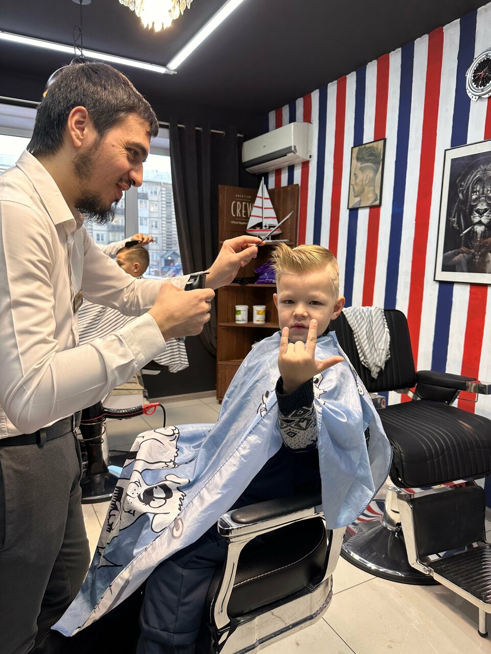 Отдичный барбершоп, все мастера топ, вожу туда сына на стрижку, всегда все вовремя, по записи, в процессе включают мультики, в конце процедуры получает конфетки)