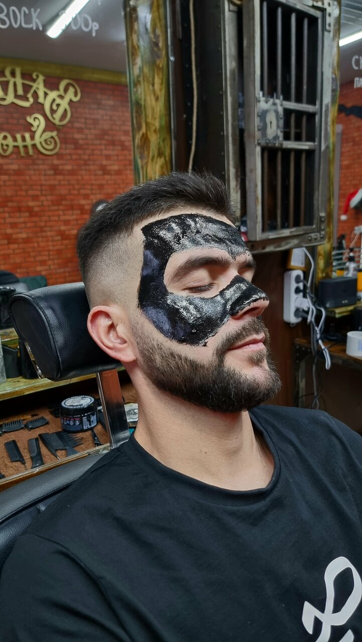Обрабатываем лицо хлоргексидином,лёгкими массажными движениями наносим скраб,распариваем лицо и наносим черная маска 'Сталные бритвы'