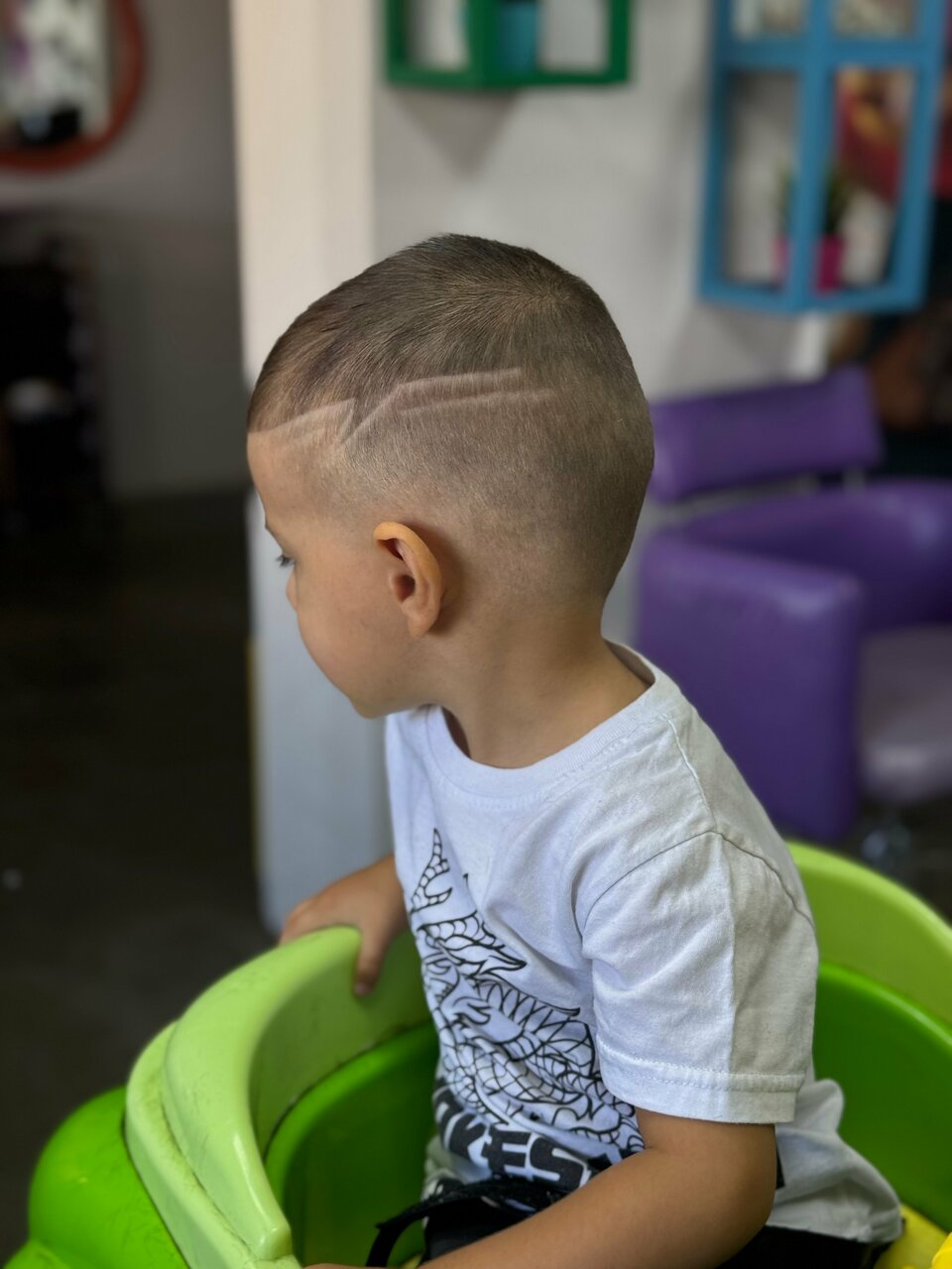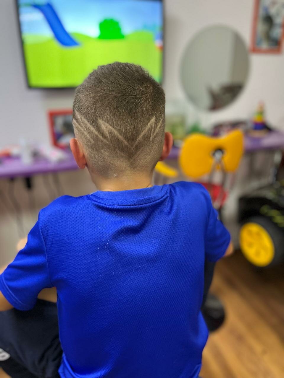 Оказались там случайно, гостили на районе у подруги с сестрой и её трёхлетним сыном, и к слову пришлось, что хорошо бы его подстричь как-нибудь креативно, подруга нам и подсказала, что рядом есть детская парикмахерская. Вот мы и решили попробовать необычную стрижку для Макса. Пришли в районе обеда, девушка, (кажется Маша) была занята другим клиентом, но предложила подождать минут 10-15. Ребёнку было совсем не скучно ожидать, так как и в машинки поиграл на машинке ‘покатался’. А когда подошло время стричься, малыш был настроен серьёзно, так как немного понаблюдал за работой мастера, сел без уговоров, выбрал мультик, и сам выбрал себе рисунок из предложенных. Для первого раза решили просто выбрить молнию с одной стороны. Макс был в полном восторге. Всё прошло отлично.